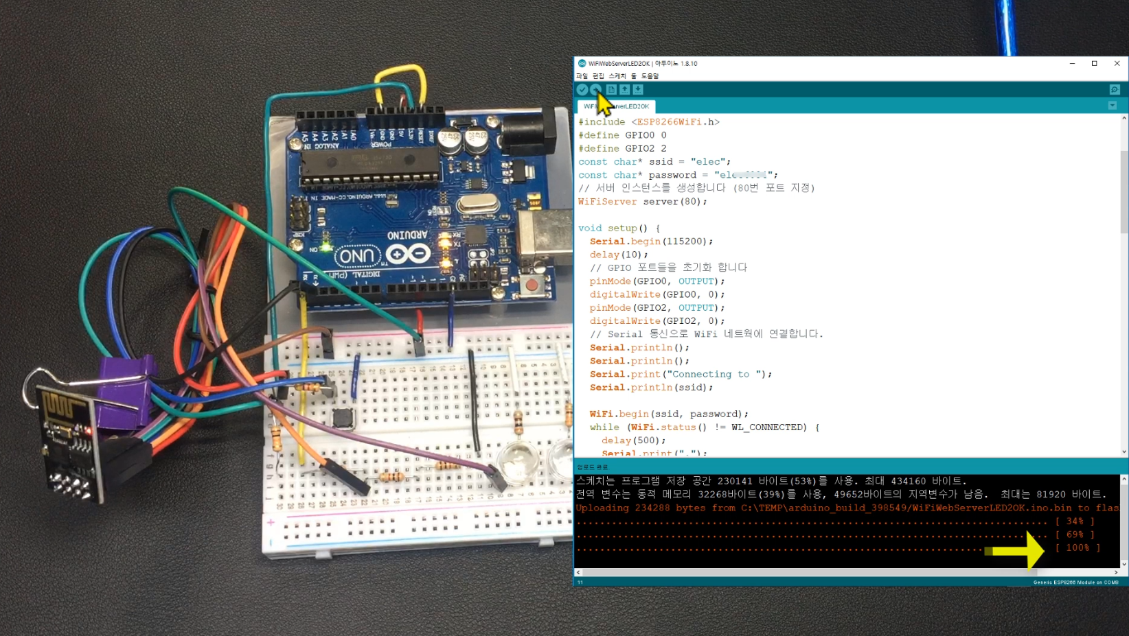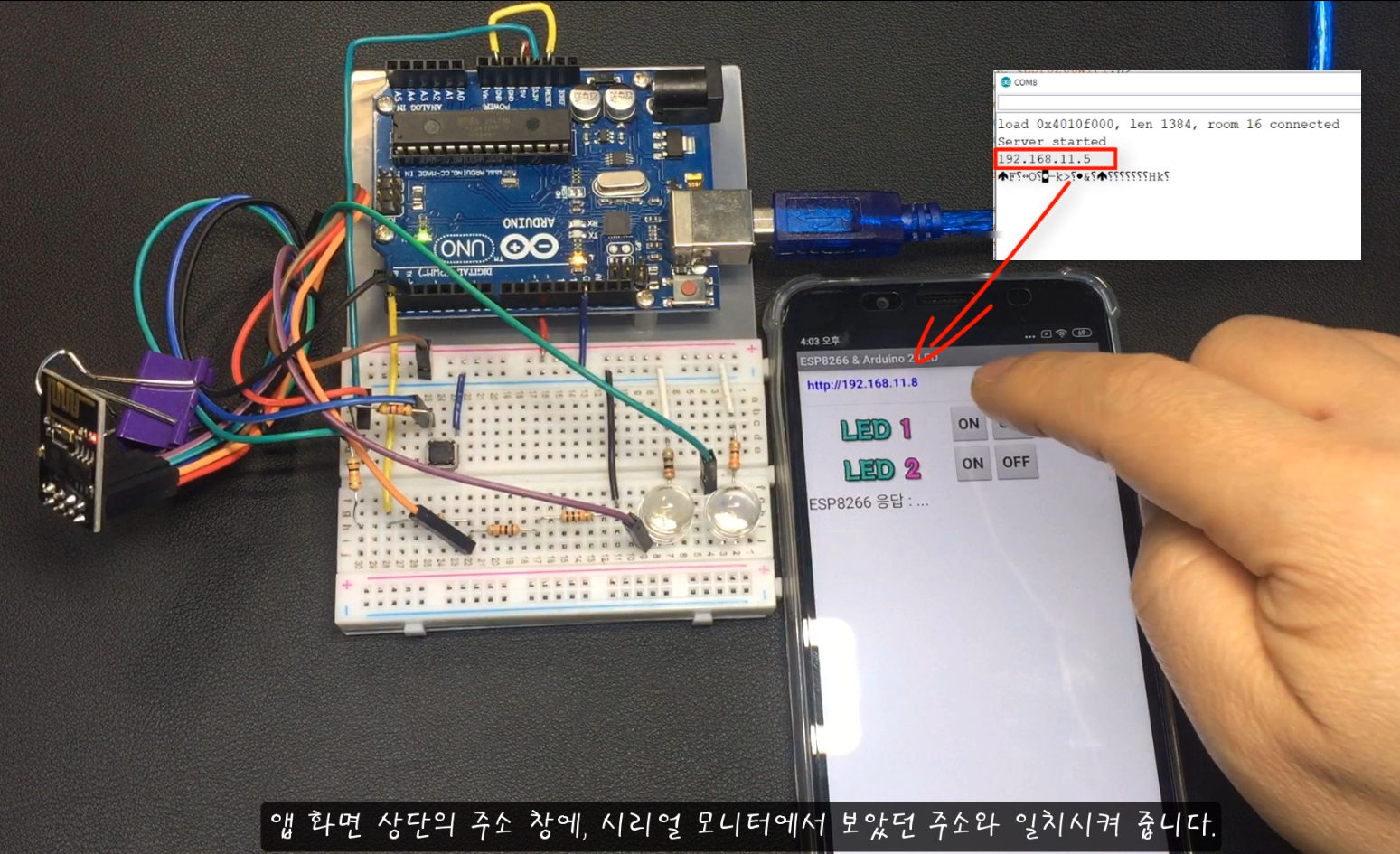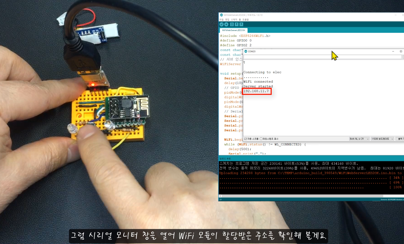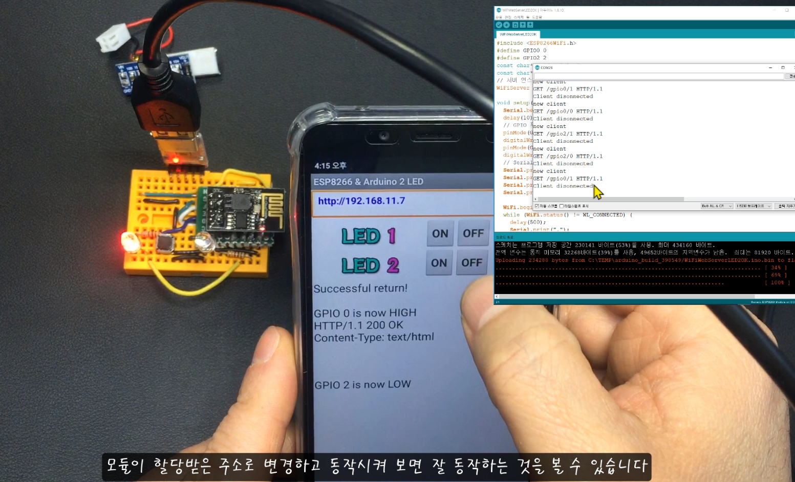 * (접속 IP 주소는 코드 업로드가 완료되면 시리얼모니터(115200bps)를 통해 확인 가능함)