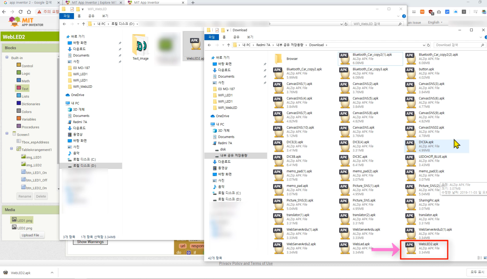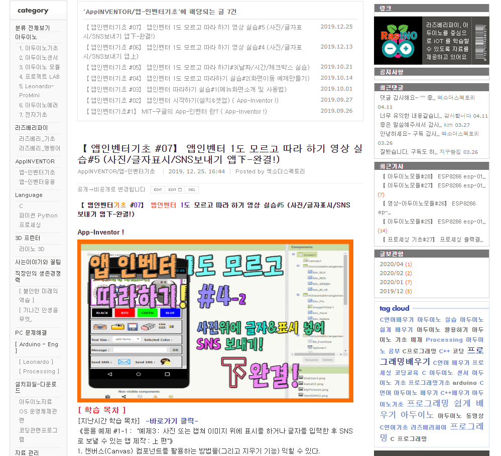 물론, 스마트폰의 앱도 앱인벤터를 이용해 직접 만드는 과정도 설명드리는데요, 앱을 스토어에 올리지 않기 때문에 비용 발생도 없으며, 어려운 자바언어를 사용하지 않고 구글의 스크래치와 같은 블록코딩 방식을 이용하기 때문에 처음 사용자라도 10분이면 충분히 앱을 만들 수 있으니, 자신감을 가지고 지금 바로 실습해 보세요. 그리고, 앱인벤터 메뉴부터 기초 앱제작 과정의 콘텐츠 글도 여기 라즈이노IOT 게시판에 올려져 있으니 먼저 참고해도 좋을 듯 합니다.