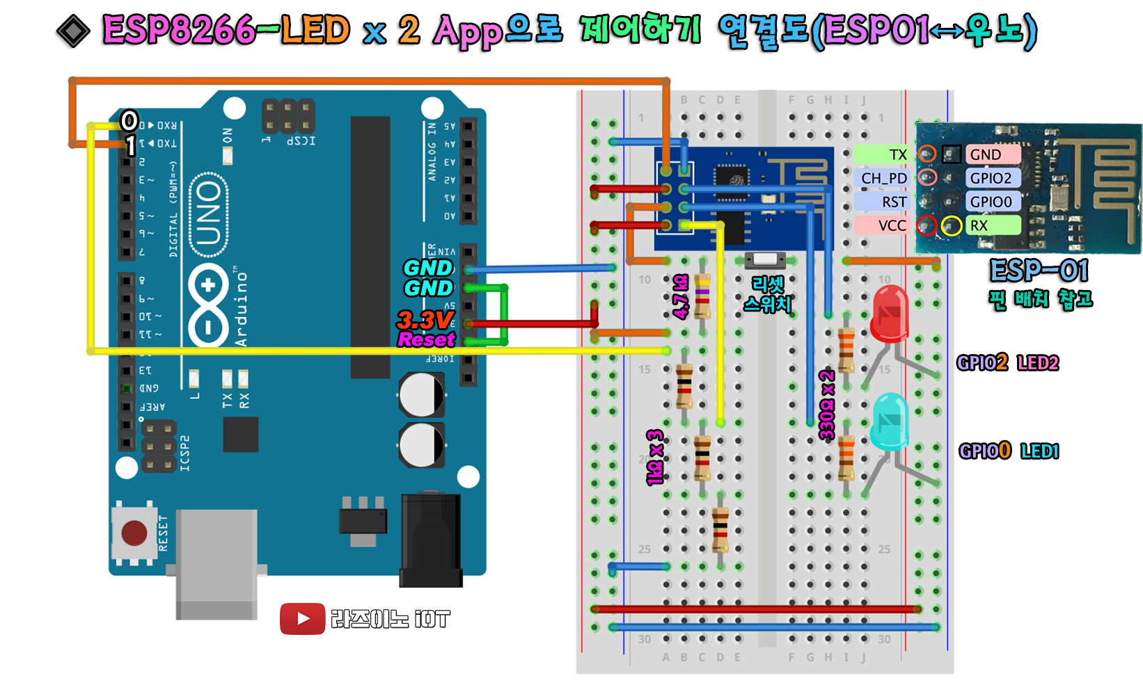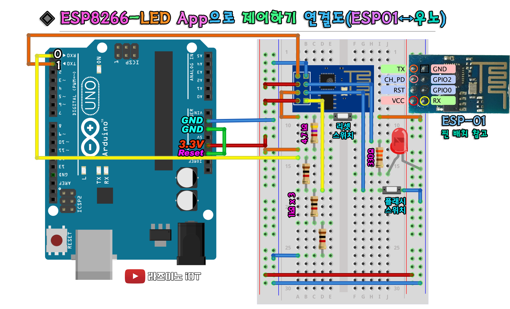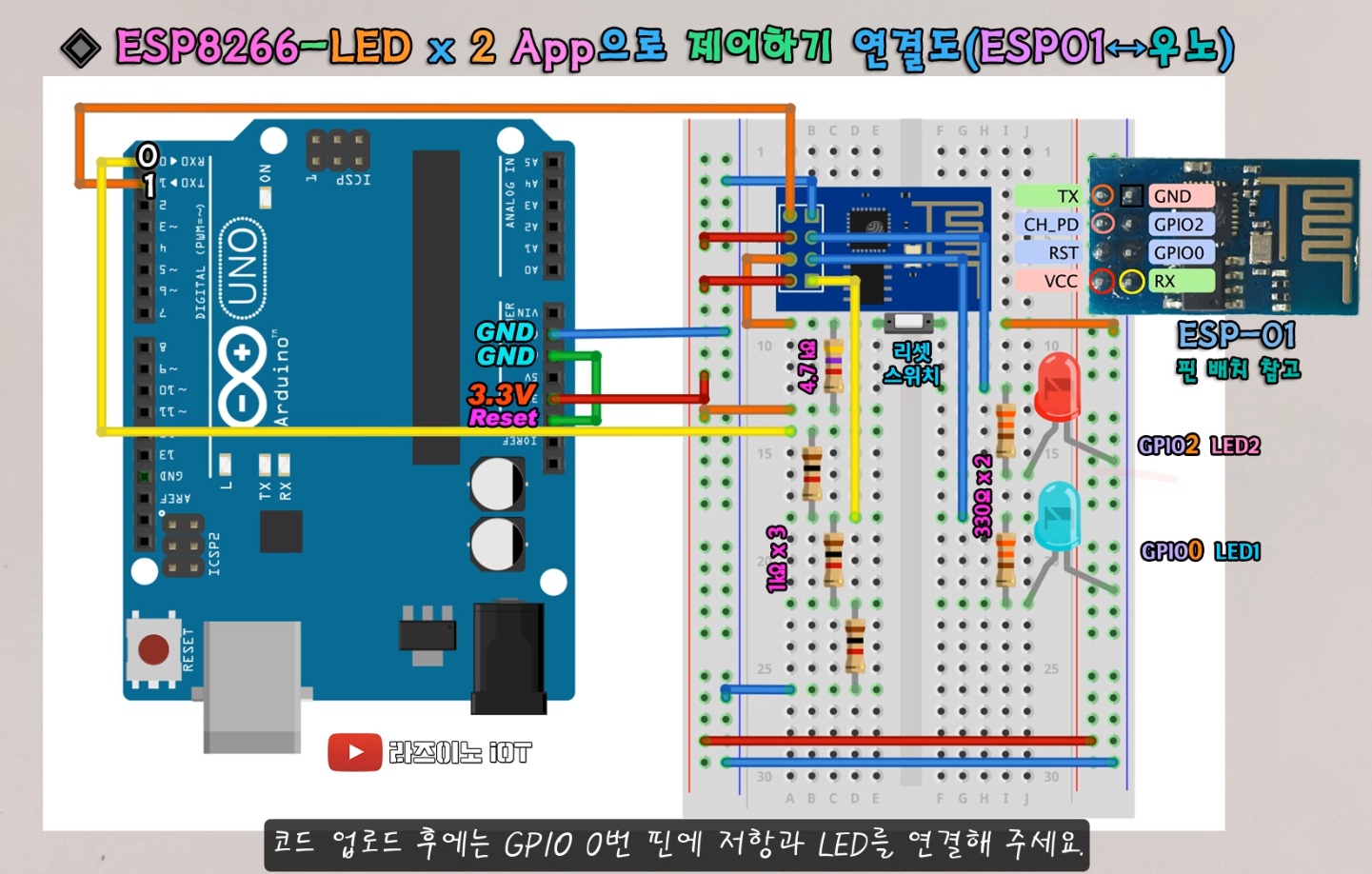 그래서, 우노를 이용할때 #1번 회로 연결로 코드를 업로드 시키고, #2번 회로로 연결해서 LED를 GPIO 0번 단자까지 모두 연결 시켜 돌리기 위한 회로를 의미합니다.
