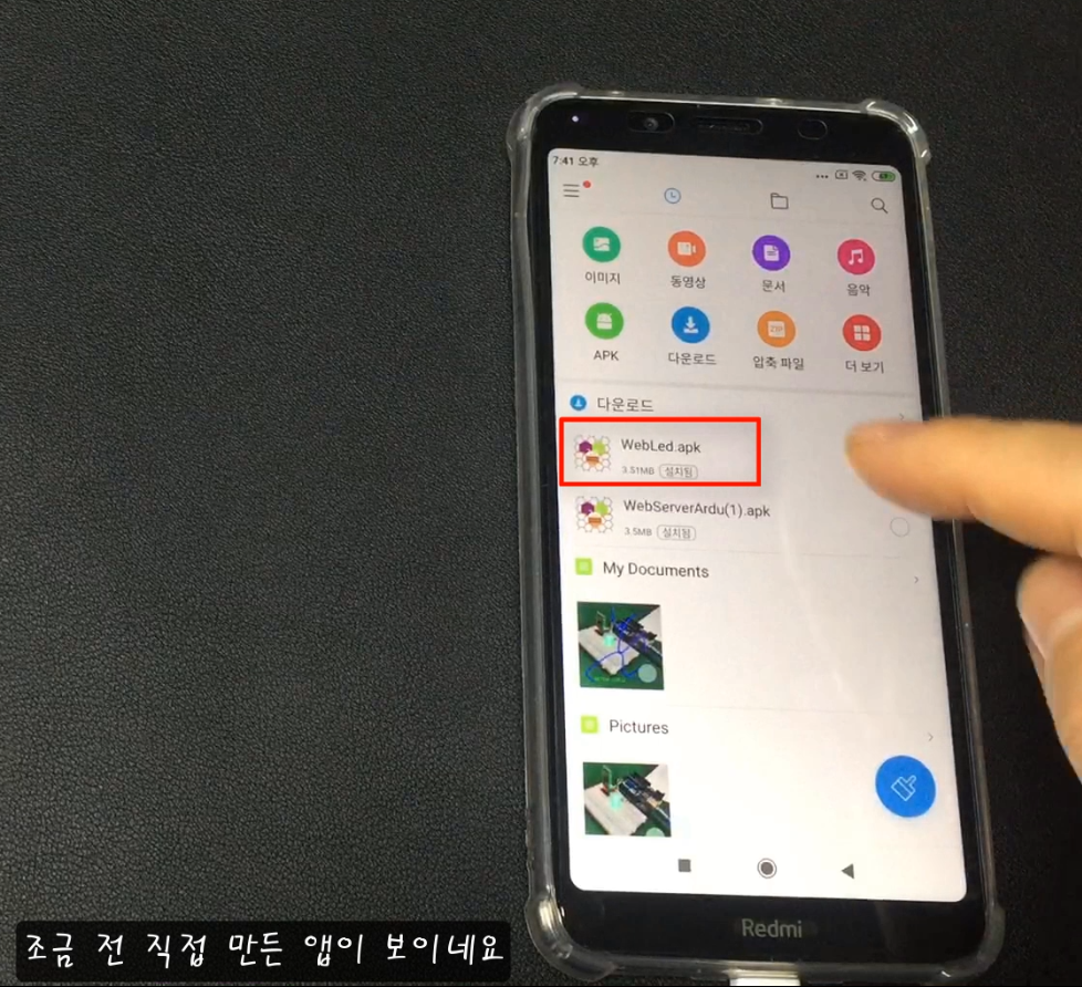 - 그럼, 스마트폰에서 파일탐색앱 같은 것을 실행시켜 스마트폰에 옮겨진 앱설치파일을 찾아 설치해주세요. ( 동의를 묻는 팝업창이 뜨면 모드 예로 해주셔야 설치가 진행됩니다)