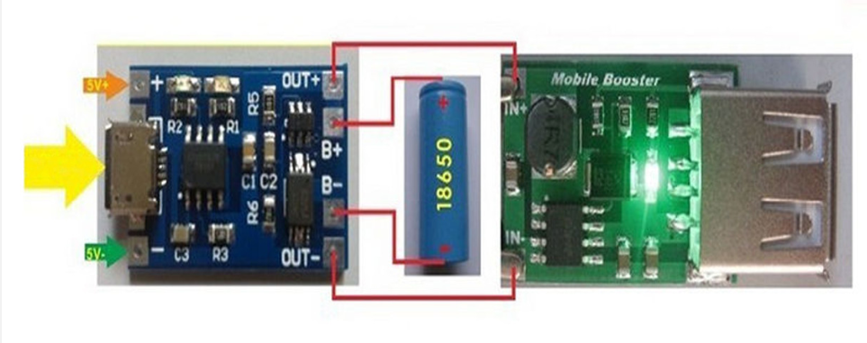 또한 , 전자 키트나 공작물 DIY를 하다보면, 5V가 필요한 키트에 3.7V 18650 배터리 하나만 사용해서 작동도 되고 충전도 되게 하고 싶을 때가 생기는데요, 이럴 때는 아래처럼, 18650의 3.7V 출력을 5V 정격 출력으로 승압(전압 UP 업) 시켜주는 모듈을 사용해서 연결해 주면 됩니다.