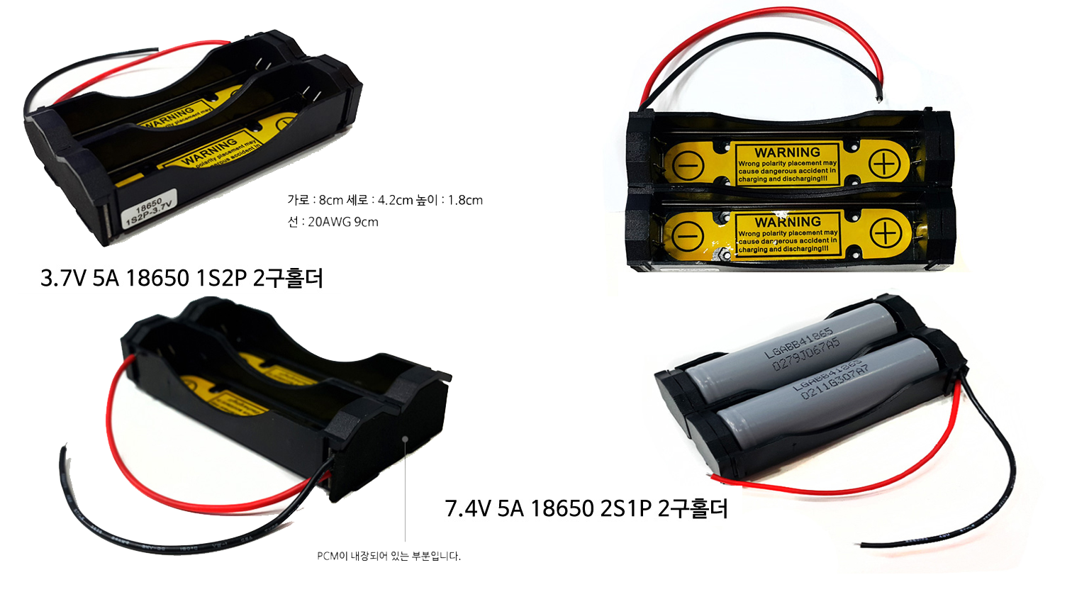 그리고 위의 PCM 보호회로가 없는 18650을 DIY회로에 직접 연결해서 사용할 수 있는 PCM내장형 18650소켓도 이렇게 판매되고 있어요. 하나는 3.7V 입출력(충방전)이 되는 PCM 1S2P 2구 소켓 이고, 하나는 7.4V 입출력(충방전)이 되는 PCM 2S1P용 2구 소켓입니다. (현재 옥션 등에도 판매중 http://itempage3.auction.co.kr/DetailView.aspx?ItemNo=A544086734&frm3=V2 ) 1S2P , 2S1P 에서 S는 Serial(직렬 연결), P는 Parallel(병렬)을 의미 합니다.