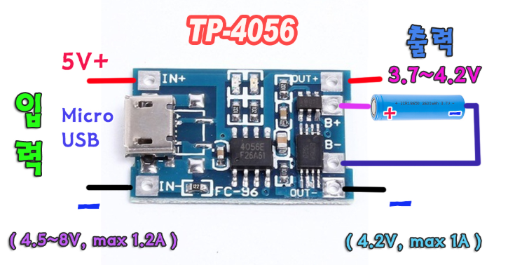 일반적으로 18650 충전을 위해서는 3.7V 보다 높은 4.2V(완충전압) 정도의 전압으로 충전하게 됩니다. 하지만 충전시 이 전압(4.2v) 이상을 넘어서는 전압이 유입 되지 않토록 과충전 보호기능이 필요하게 됩니다.