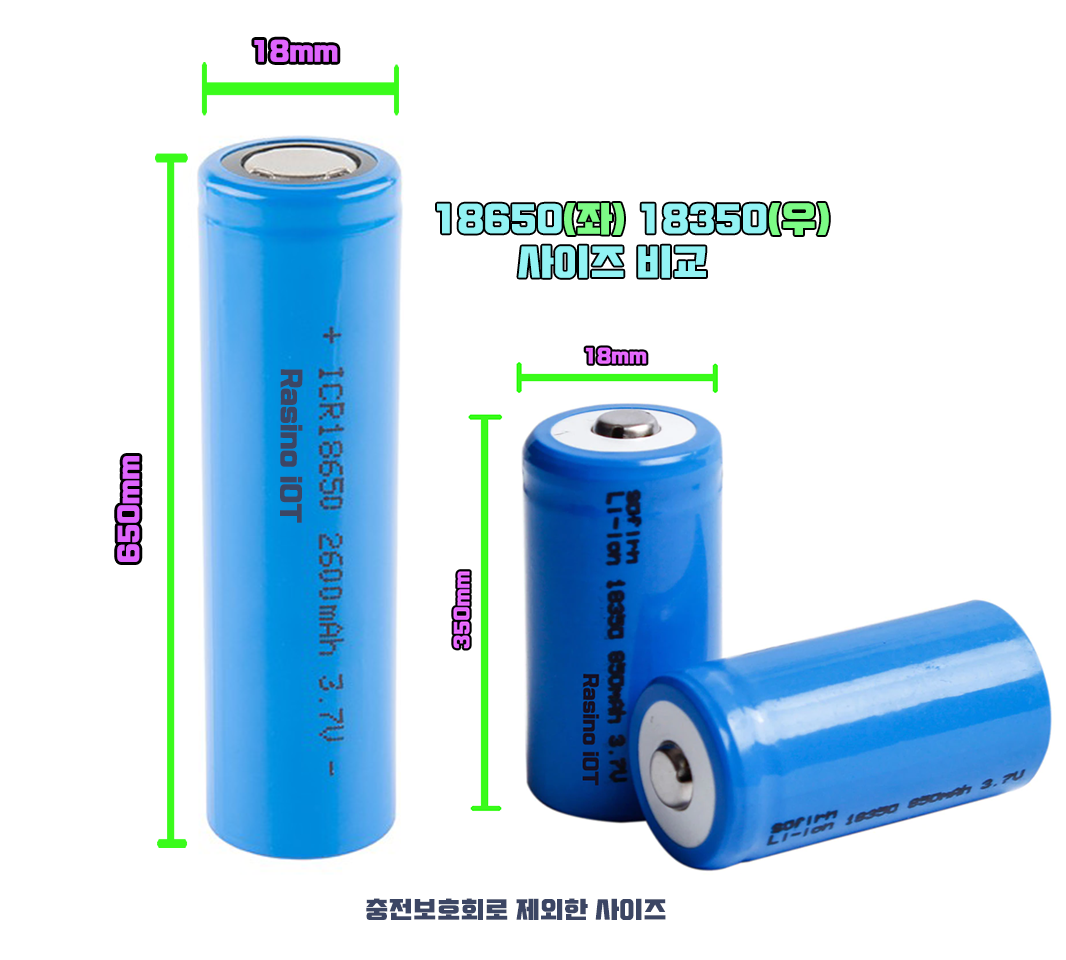 - 18650 자체가 이름인데, 가로(직경) 18mm X 높이(길이) 650mm 여서 18650이라는 이름이 붙여졌습니다. (충전 보호회로 높이 없는 모듈 길이)