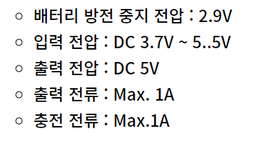 ( 일반적으로 사용되는 18650 3.6~3.7V 스펙 배터리를 기준으로 설명 드립니다. 실제 출력은 3.7V 이상 나올 수 있으며, 보통 완충을 위한 전압은 4.2V 정도를 사용합니다.)