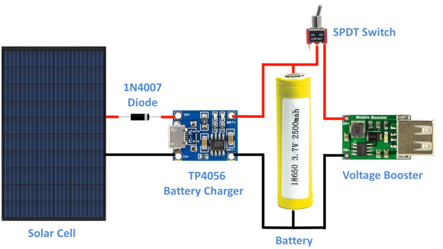 아래 회로에서 tp4056은 과충전방지회로가 없는 타입을 사용했지만, 과충전방지회로가 있는 타입 또한 Out+, - 단자를 이용해서 같은 연결로 사용하면 됩니다.