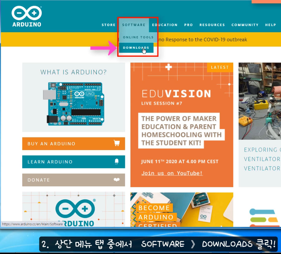 1. 홈페이지 상단 메뉴 중 "Software 》 Downloads"를 클릭하세요.