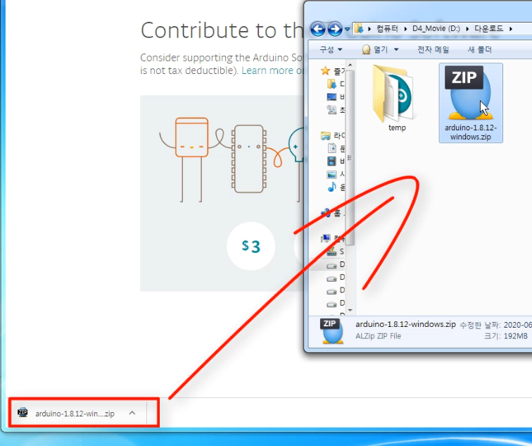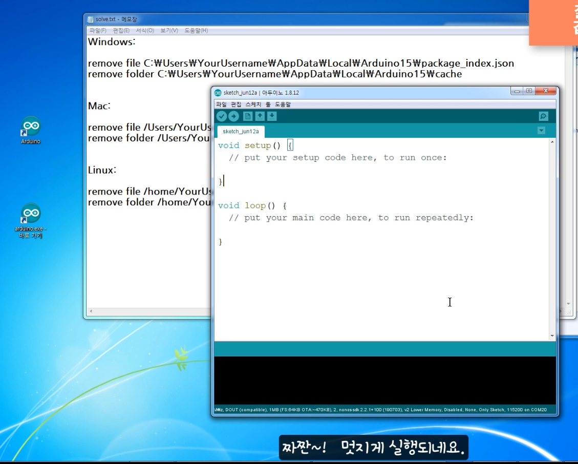 : 만약 이 방법으로 무설치 버전을 실행시켰음에도, 같은 증상으로 아두이노 스케치 IDE가 더 이상 실행 되지 않을 때는, 아래로 계속 진행 해보세요.