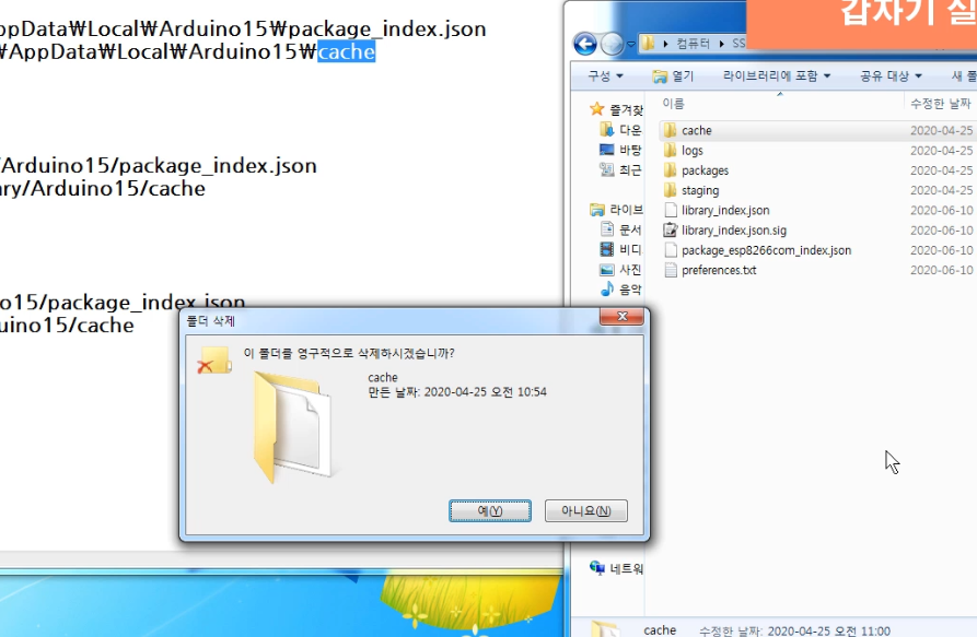 ※ 참고로 조금 전에 삭제한 cashe 폴더가 자동으로 재생성 되기 전까지는 아두이노 IDE 프로그램이 로딩 되는데 몇 초 정도 느리게 실행될 수 있으니 참고하세요~