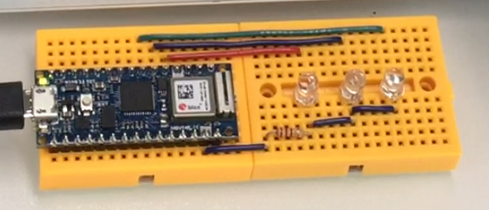 2. Nano 33 보드에 LED 3개를 연결한다. (점퍼선을 이용하지 않고 굵은 단선을 이용한 방법)