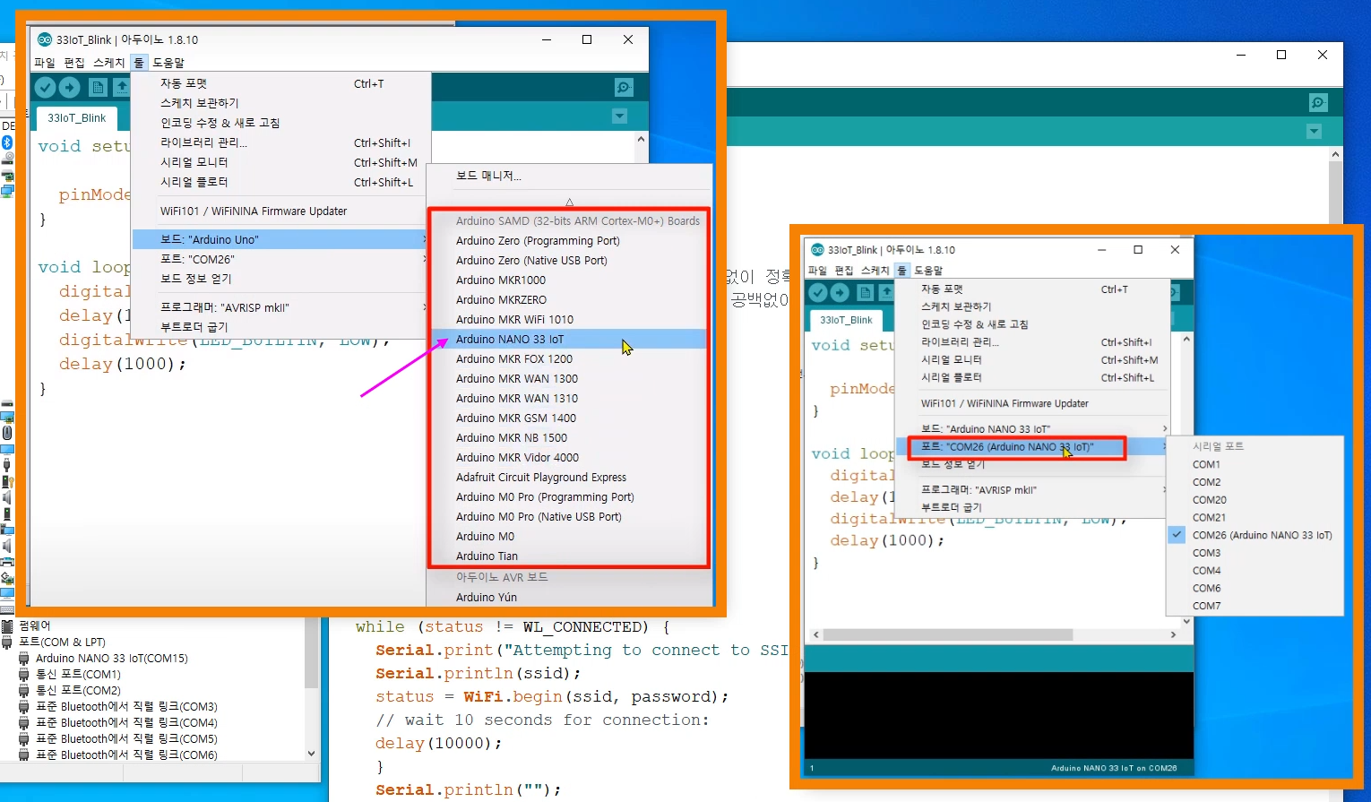 - 보드 설치가 완료되면, 아래처럼 "Arduino NANO 33 IoT" 보드를 선택하고, 포트에는 "COMxx (Arduino NANO 33 IoT)" 인식된 포트를 선택해 주세요.