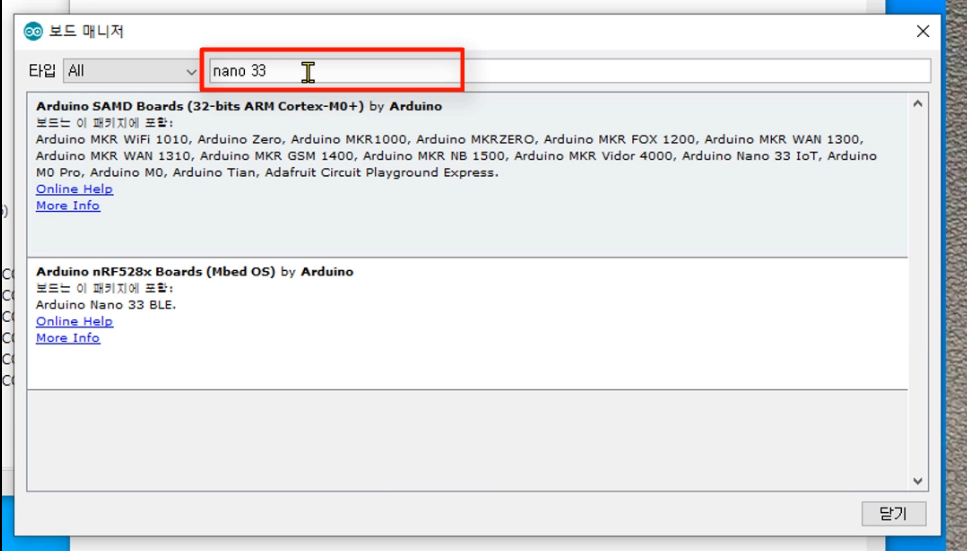 - 다음으로 아두이노 IDE 스케치 툴에 Nano 33 IoT 제품군을 추가해 주어야 합니다. 스케치 IDE에서는 기본적으로 해당 보드가 설치되어 있지 않기 때문에, 메뉴에서, 툴 》 보드 》보드매니저를 열어 NANO 관련 추가 제품군을 등록해 주어야 합니다. 보드 매니저 검색창에서 'nano 33'으로 검색한 다음, 아래 Arduino SAMD Boards(32-bits ARM Cortex-M0+)를 설치해주세요. (설치 과정에 시간이 다소 걸릴 수 있으니, 중간에 창을 닫지 말고 끝까지 기다려 주세요)