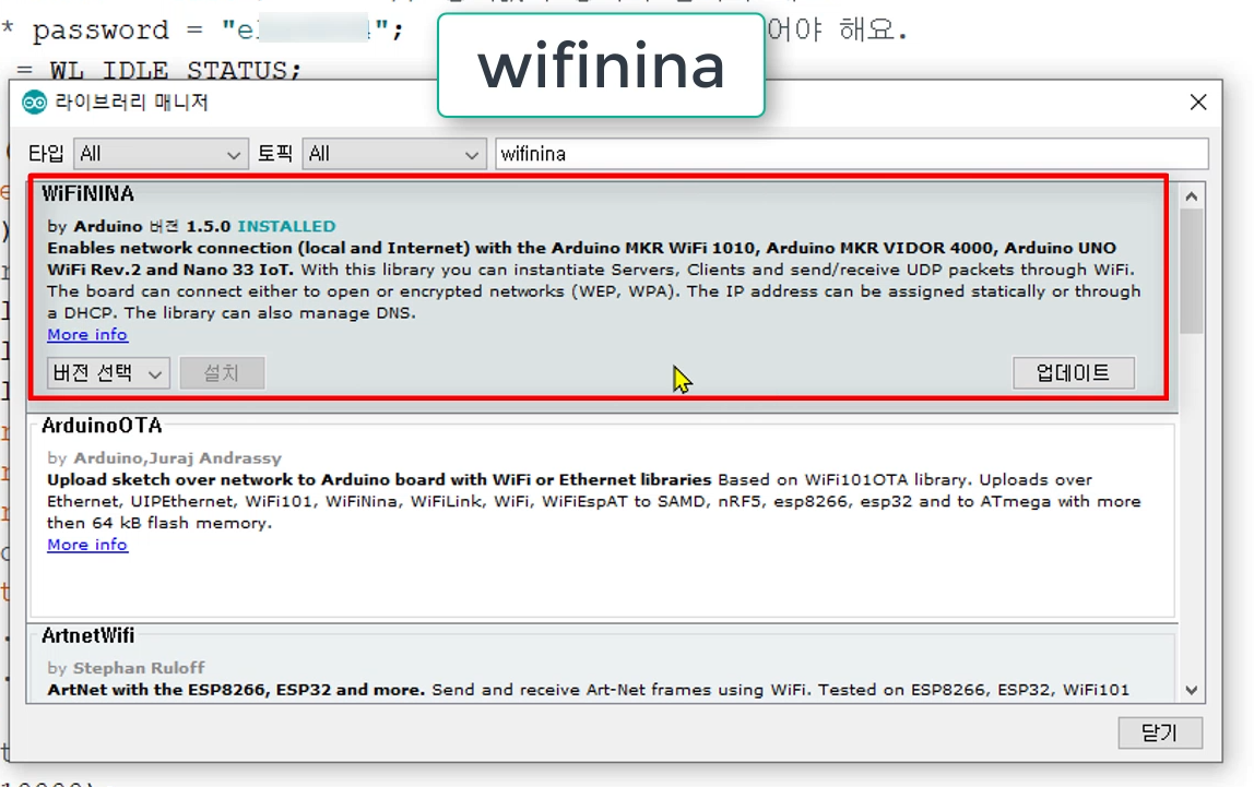 - 또한 nano 33 IoT 보드는 wifinina라는 칩셋을 사용하는데요, 이와 관련한 라이브러리를 아두이노 라이브러리 매니저 창에서 설치해주면 됩니다. ( 툴 》 라이브러리 관리 》 라이브러리 매니저 , 'wifinina'로 검색)