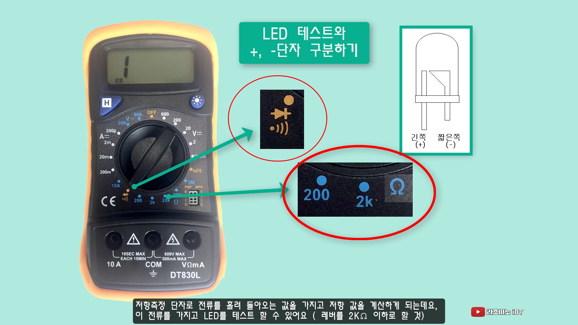 - 저항 측정 단자로 전류를 흘려 돌아오는 값을 가지고 저항 값을 계산하게 되는데요, 이 전류를 가지고 LED를 켜볼 수 있어요, 테스터의 측정 레인지는 다이오드 혹은 소리 표시가 있는 도통 단자로 놓거나, 저항 측정 단자 중 2KΩ 이하 단자로 놓고 측정해 보세요. 2KΩ 이상에서는 내부 건전지에서 흘러나오는 전류값이 너무 작아서 LED를 켤 수 있는 용량이 되지 않기 때문입니다.