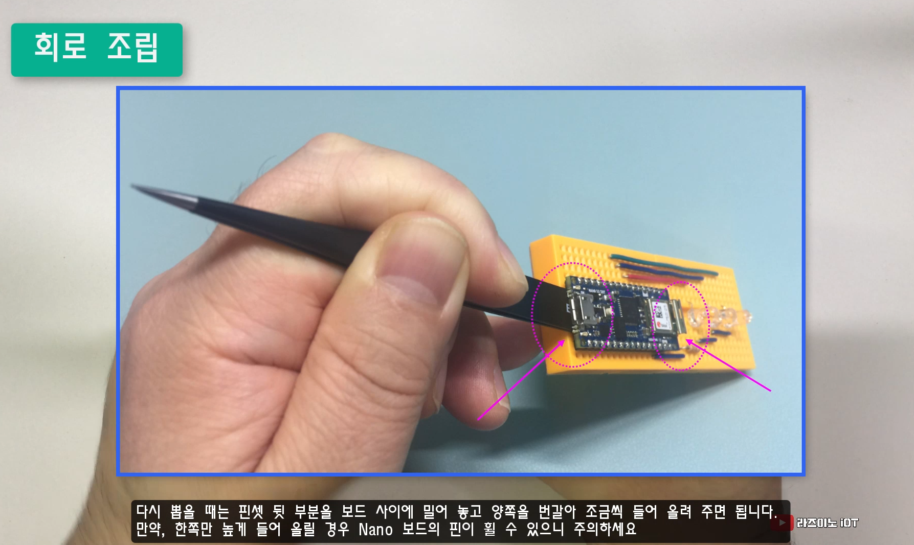 또한, 꽂은 위치를 바꾸기 위해 다시 뽑아야 할 때는 한쪽만을 많이 들어 올릴 경우 핀이 휠 수 있으니 조심해야 합니다. 그래서 일자 드라이버 혹은 핀셋의 뒷부분을 이용해서 나노와 브레드보드 사이에 밀어 넣은 다음 양쪽을 번갈아 조금씩 들어 올려 주면 핀이 휘지 않고 탈거할 수 있습니다.