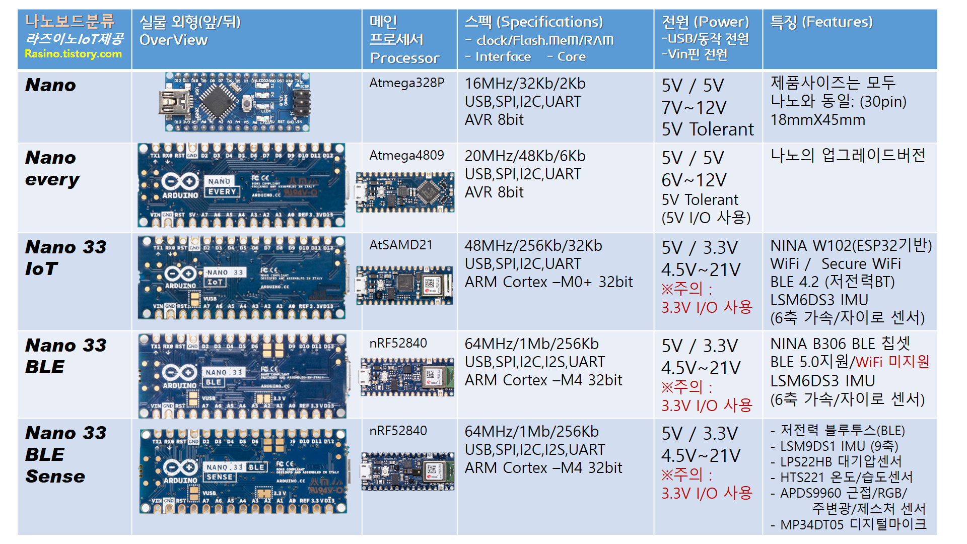 주요 특징으로는 , 기존 NANO 보드와 NANO Every 보드까지는 5V 톨러런트(Tolerant : 회로기판 내의 3.3V 부품도 5V레귤레이터를 통해 내부적으로 문제없이 처리 또는 견딜 수 있는)가 지원되지만, NANO 33 보드는 이름에서도 알 수 있듯, USB 전원을 제외하고 신호 레벨 전압을 3.3V로 주어야 손상되지 않습니다.