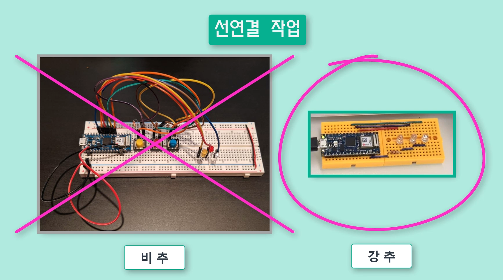 - 선 연결 작업 시 아래처럼 점퍼선을 이용하지 않고 굵은 단선을 이용하여 깔끔하게 작업하는 것을 권해드려요.