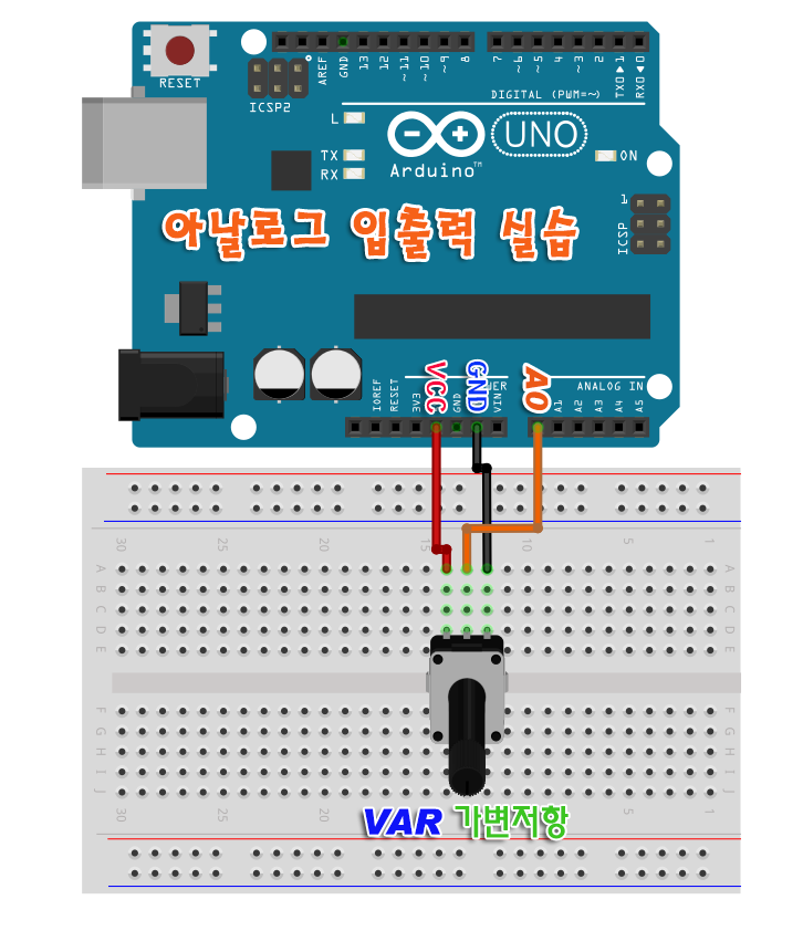 - 가변저항의 가운데 핀을 반드시 아두이노의 A0 포트에 연결해 주어야 합니다.