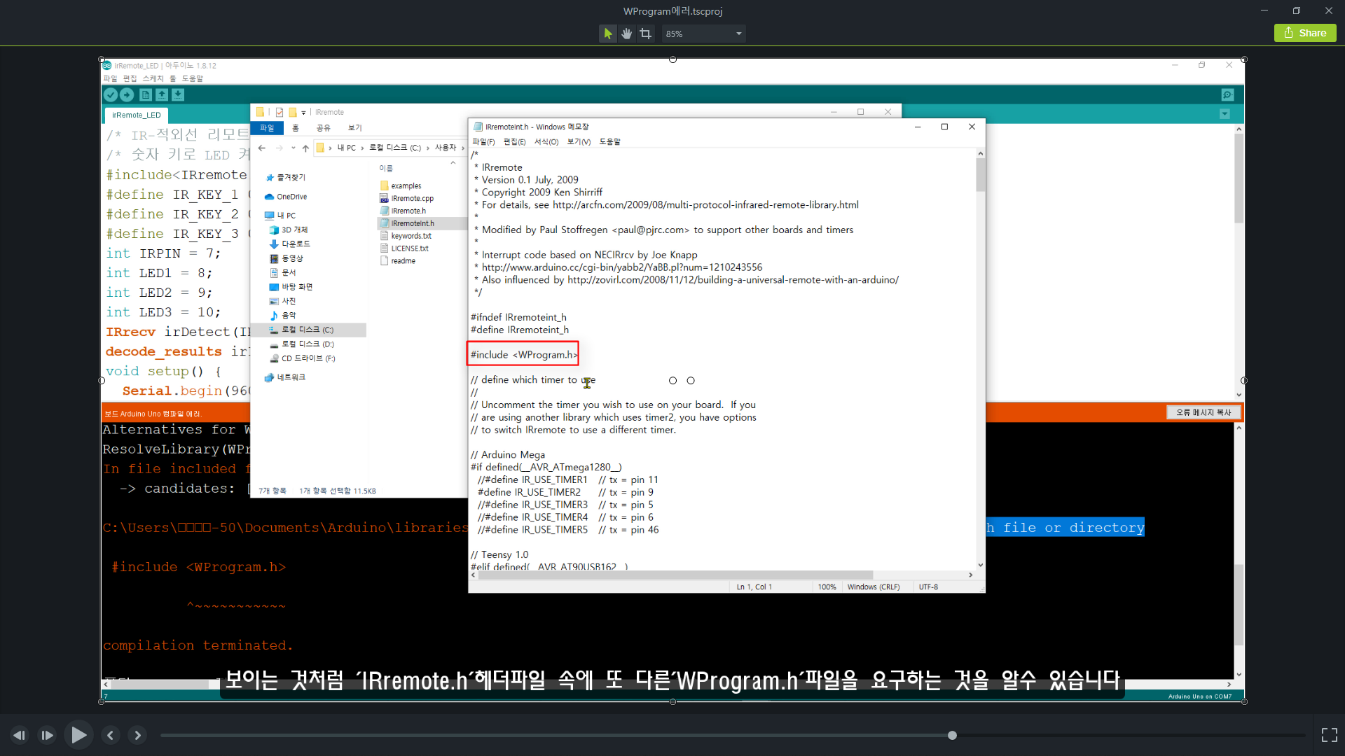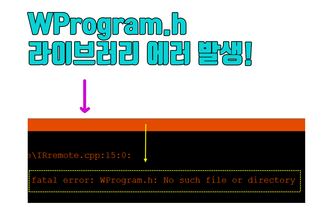 그 이유는 'IRremote.h"파일(라이브러리)속에 'WProgram.h' 파일을 요구하는 코드가 있기 때문인데요 결론적으로 'WProgram.h'파일이 없기 때문에 에러를 띄우는 것입니다.