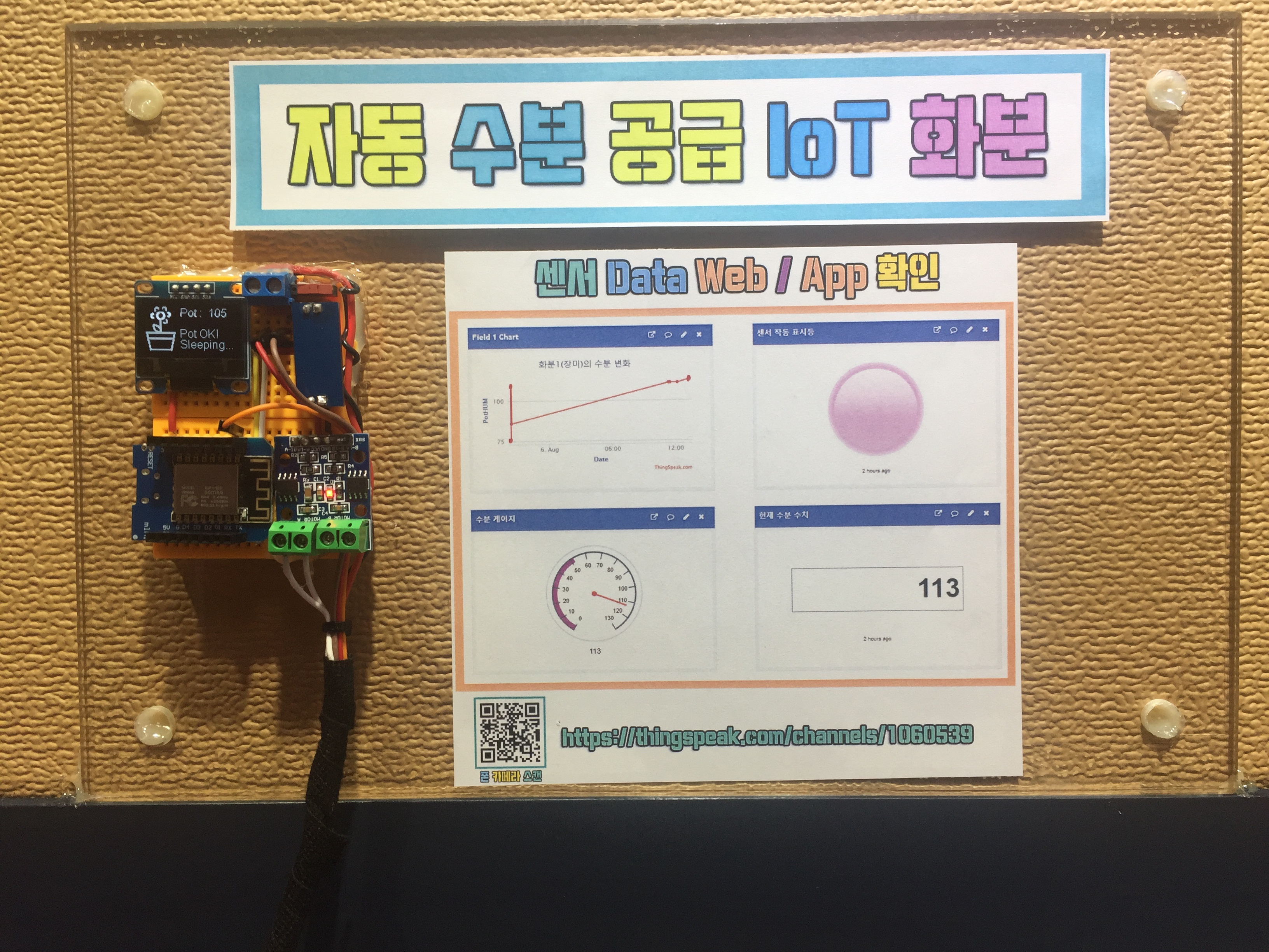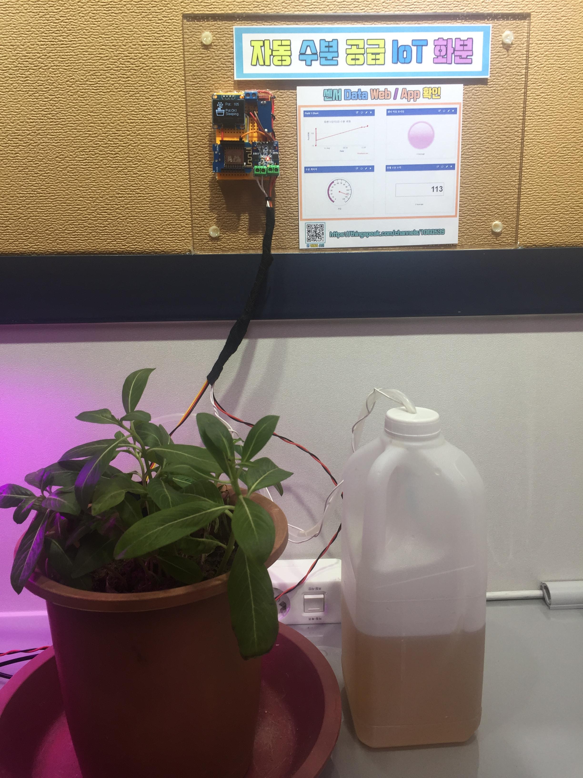 수분 공급을 자동으로 해주고 ThingSpeak 앱과 웹에서 접속하여 화분의 상태를 확인하고 데이터를 엑셀 등의 파일로 관리할 수 있는 IoT 스마트 화분입니다!