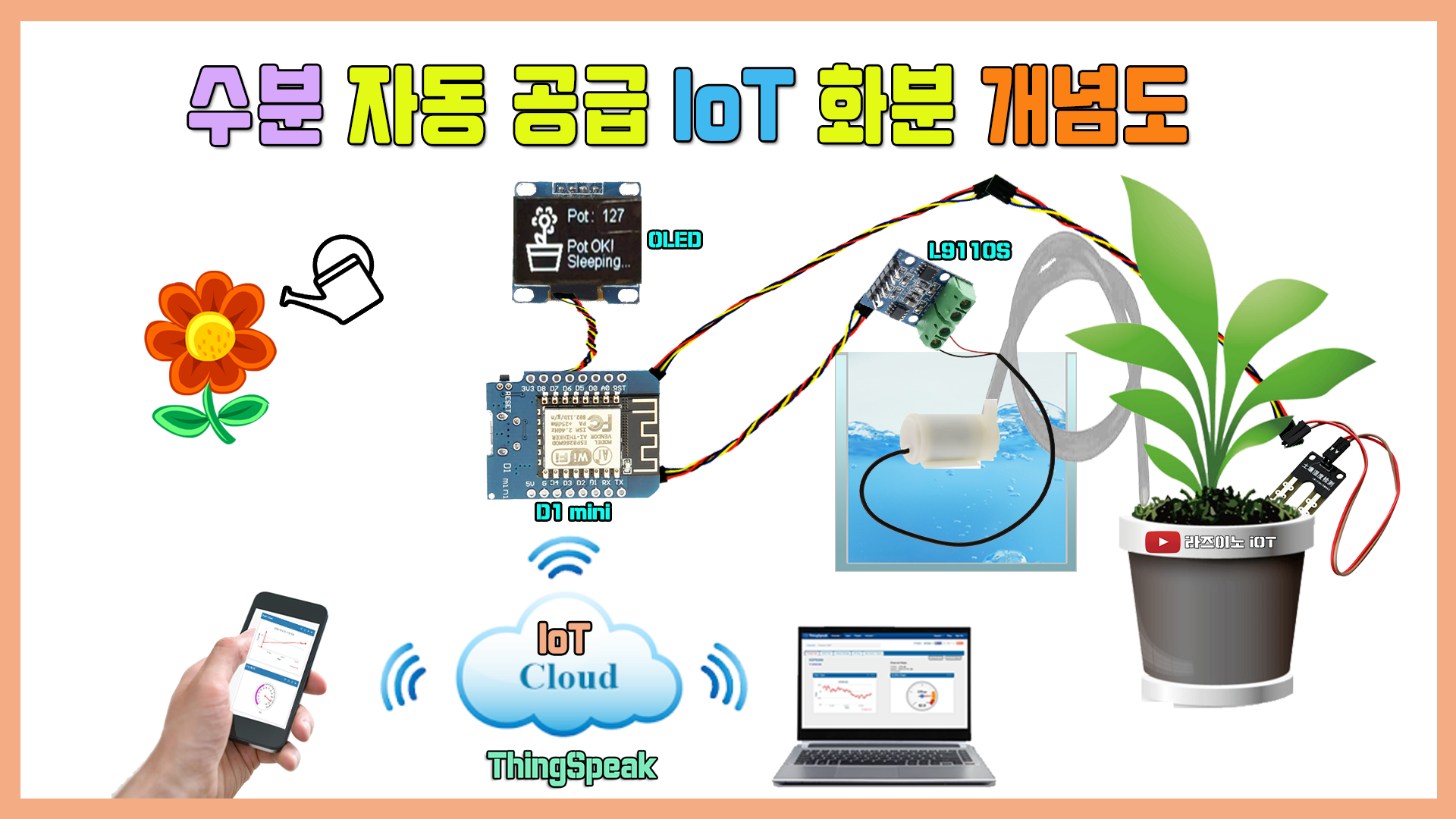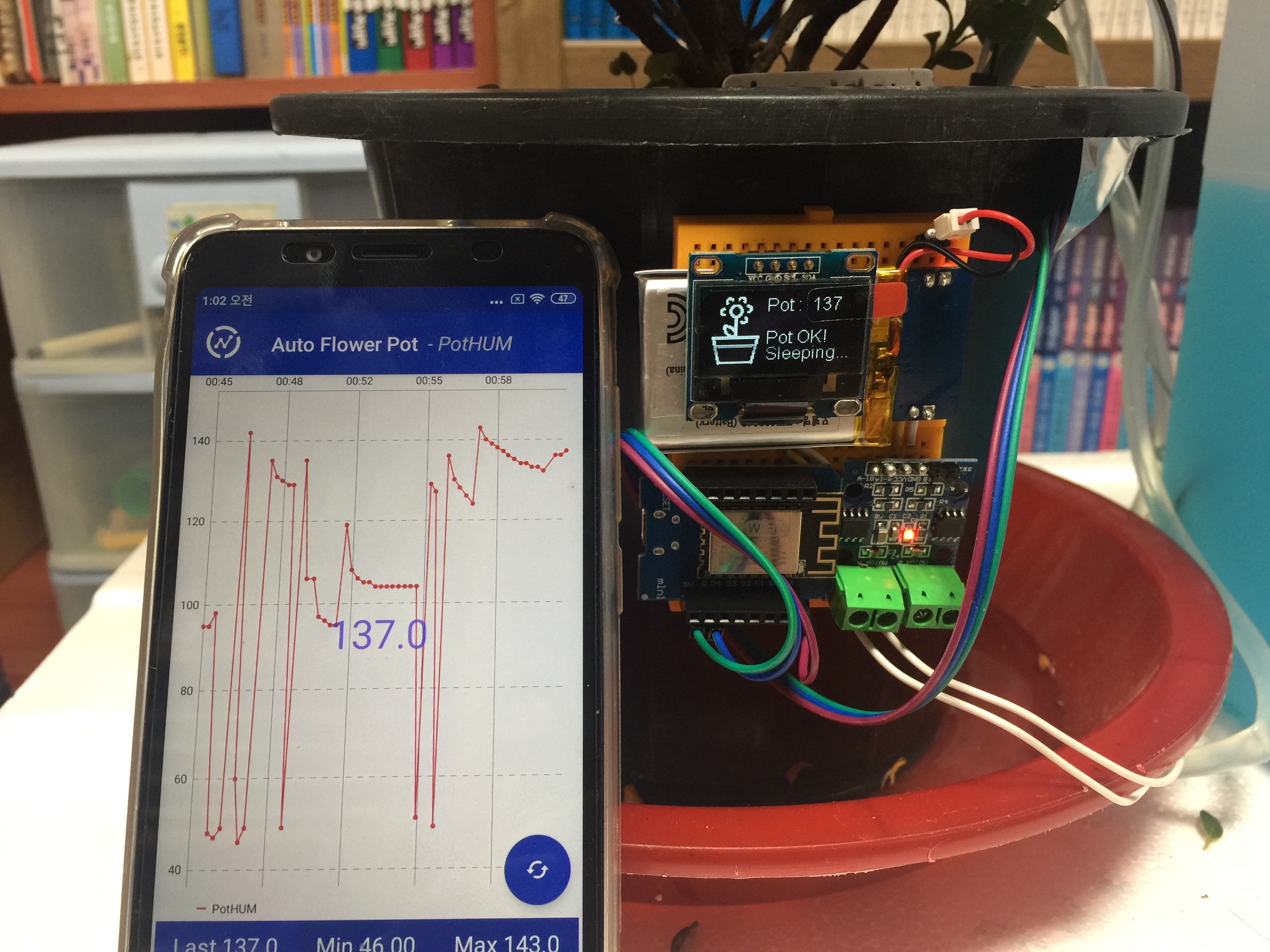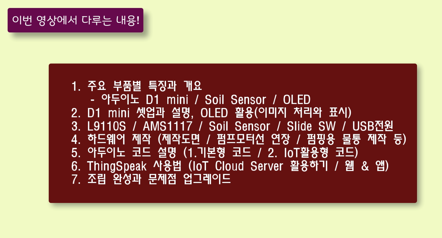 ▶ 아두이노 프로젝트 : ESP8266칩셋의 D1 mini 를 활용하여 물을 자동으로 공급할 수 있는 스마트 화분입니다.
