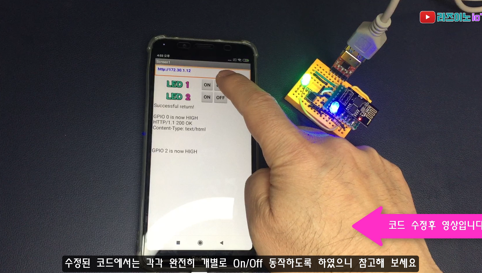 * 4. 앱화면의 버튼을 눌러 LED를 On·Off 할 수 있다.(GPIO0(LED1), GPIO2(LED2))