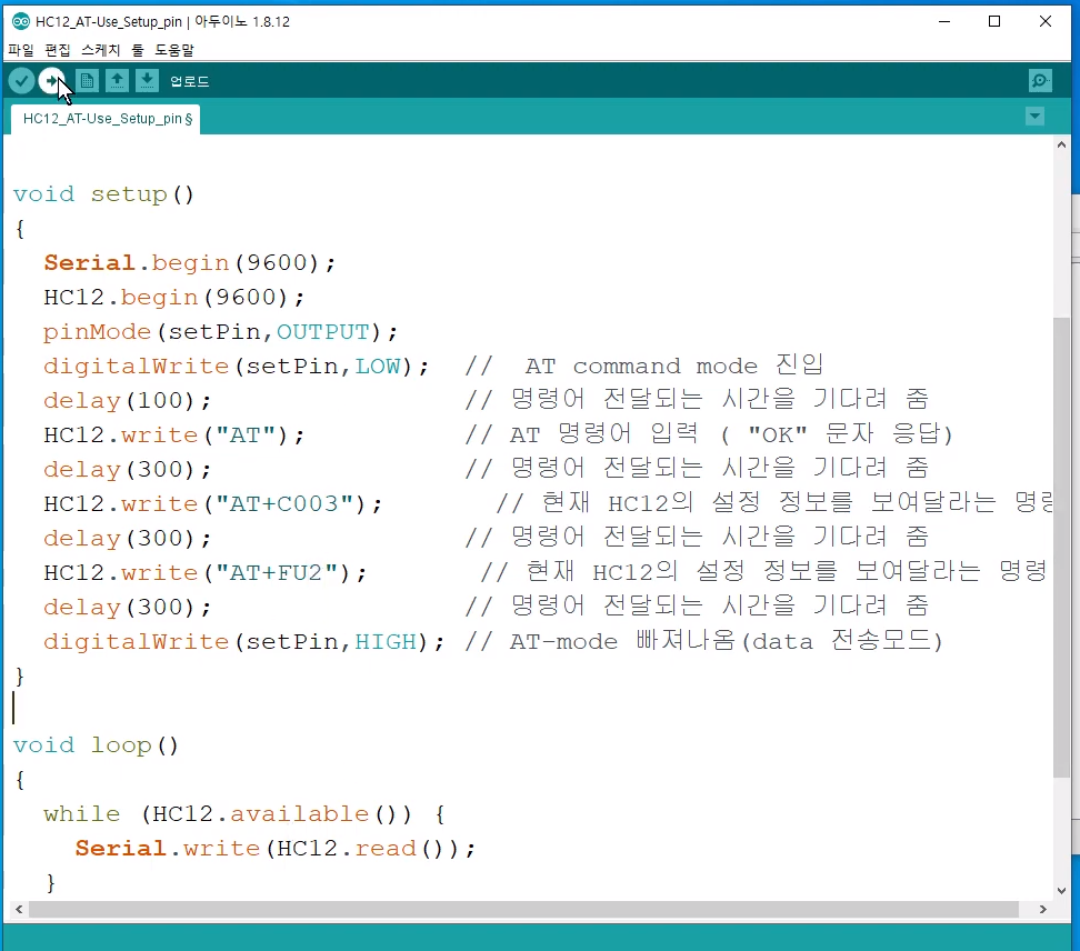 pinMode(setPin, OUTPUT); // HC12의 AT 모드 진입을 위한 아두이노 연결핀 출력설정