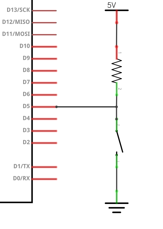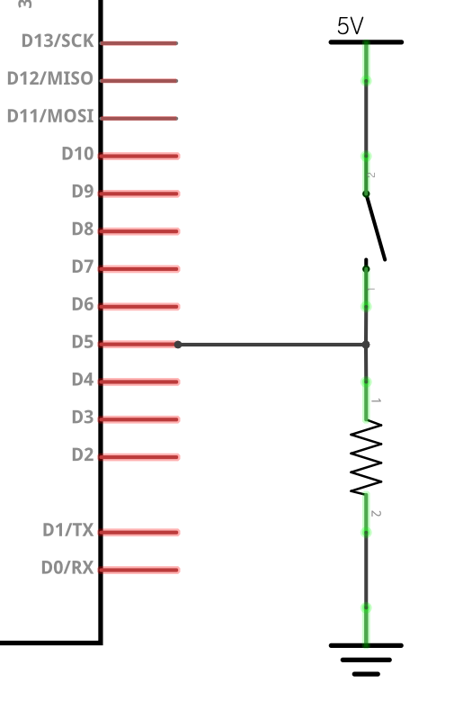 위, 이미지에서 스위치를 닫으면 GND(그라운드, 혹은 0V)에 연결되어 Low 신호가 아두이노의 D5번 포트로 입력되게 되며, 스위치를 오픈하면, 5V의 High 신호가 저항을 타고 D5로 입력되는 구조입니다. 여기서 만약에 저항을 연결하지 않고 직접 5V 전원을 D5로 연결시킬 경우, 스위치를 닫을 때, GND와 5V가 직접적으로 맞닿아 합선(Short)되어 문제가 생기게 되어 저항이 필요하며, 만약 저항과 5V 연결 자체를 하지 않게 될 경우, 스위치를 닫을 때는 확실한 Low신호가 입력되나, 스위치를 오픈할 경우에는 확실한 High 신호가 입력되지 않아 불안정해집니다. 따라서, 이런 이유 때문에 스위치와 함께 사용하게 되는 저항을 일컫어, 확실하게 +전원(5V, VCC)으로 끌어올린다(당긴다)하여, Pull UP 저항이라 칭합니다. 마찬가지로, 아래와 같은 연결의 저항을 풀 다운 저항이라 칭합니다.