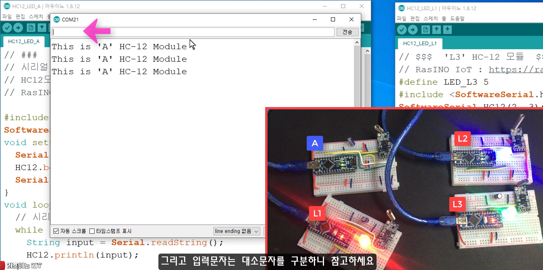 Serial.println("This is 'A' HC-12 Module"); // 2번째 아두이노 코드는 'B'로 변경