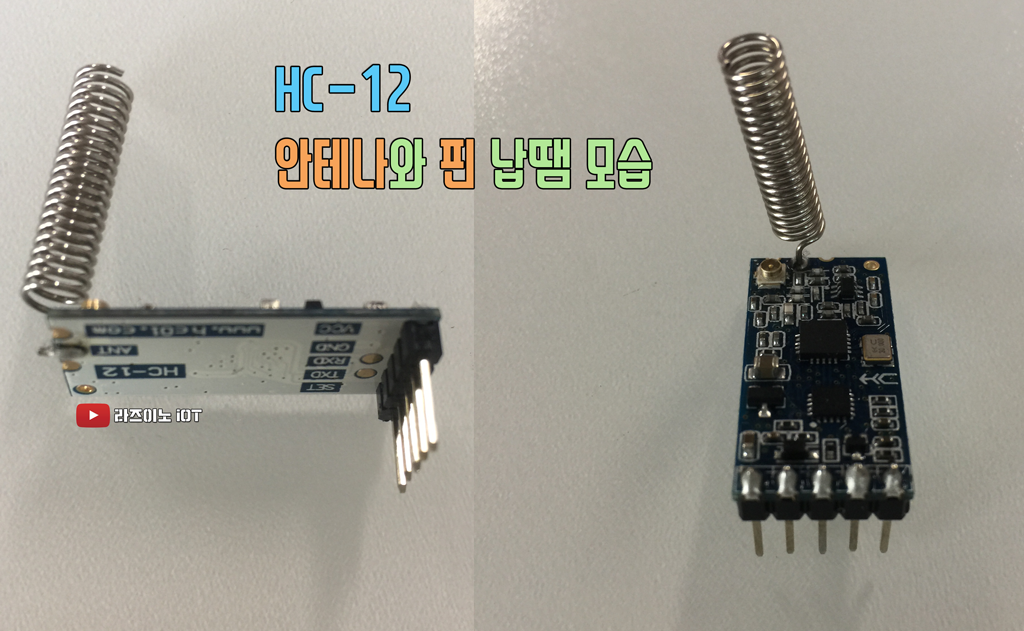 아래는 스프링 안테나와 핀의 납땜 모습입니다. 스프링은 세우지 않고 일자로 눕혀 납땜해도 상관없고, 핀도 90도 직각으로 꺾이는 핀을 따로 구해서 HC-12 모듈이 기판이나 브레드보드에 세워 꽂을 수도 있으니 참고하세요.