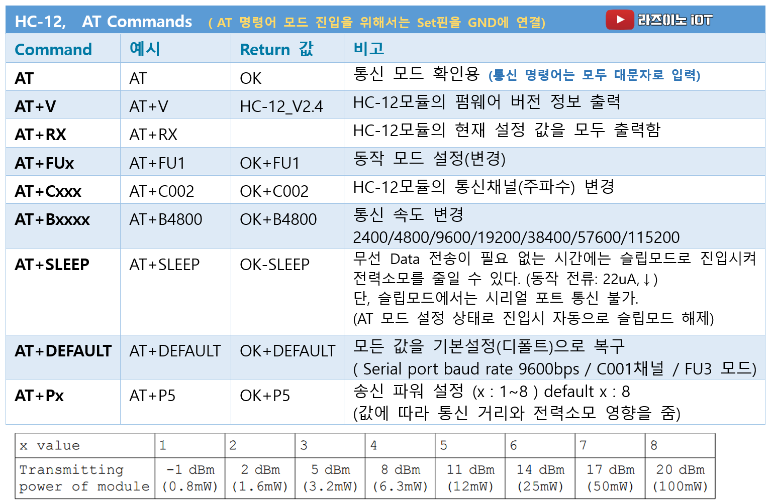 * AT명령어를 수정하면 통신속도(거리)/ 동작(통신)모드 / 슬립모드 / 송신파워 등의 설정이 가능함