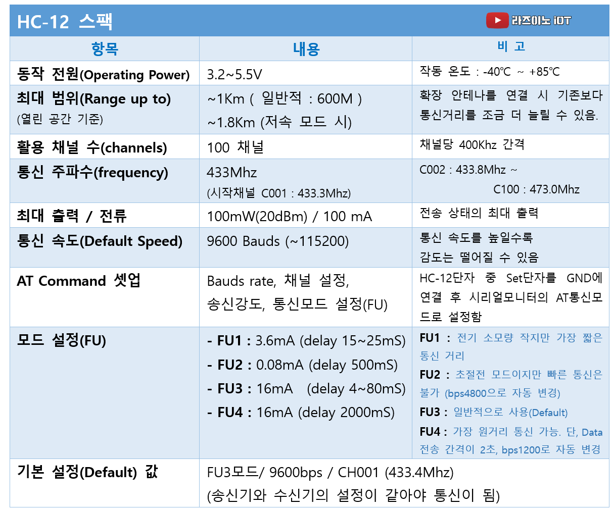 《 HC12의 스펙을 하나의 테이블로 보기 좋게 정리해보았습니다 》
