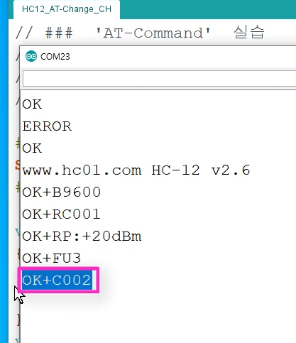 HC12.print("AT+C002"); // 채널 2로 변경하는 AT 명령어 보냄