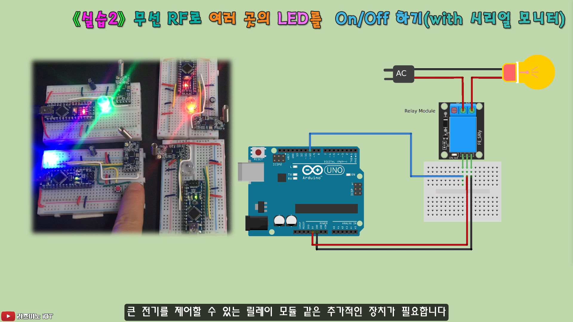 ▶ 실습 준비 : 회로는 두 가지를 준비합니다. 버튼(스위치) 2개가 들어간 1번 회로와, 신호를 수신하여 적용되었다는 것을 알 수 있도록 LED를 연결한 2번 회로로 구성됩니다. 또한, 무선 RF의 장점인 채널이 일치하면 1대 N의 통신이 가능함을 보여드립니다. 이 때는 똑같이 적용된 2번 회로가 2개 이상 필요합니다. 기본적으로, 2번 회로 하나만 있어도 실습 5의 학습은 가능합니다.
