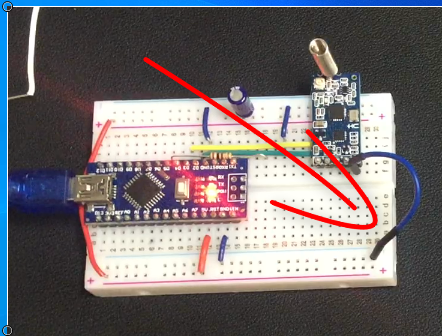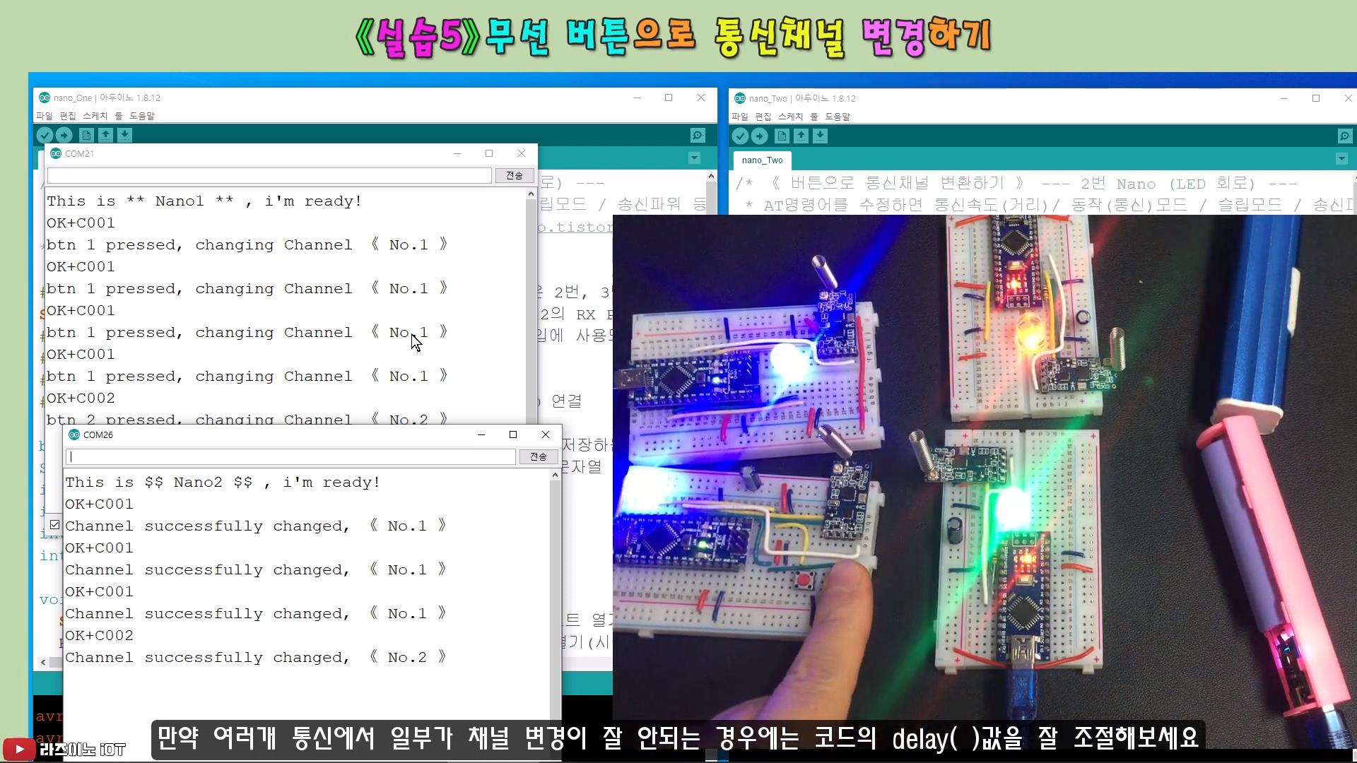 : 회로를 아래와 같이 구성하고 PC와 연결하여 아두이노 코드를 업로드하면, 코딩 루틴에 의해 자동으로 채널이 001번 채널에서 002번 채널로 변경되게 됩니다.