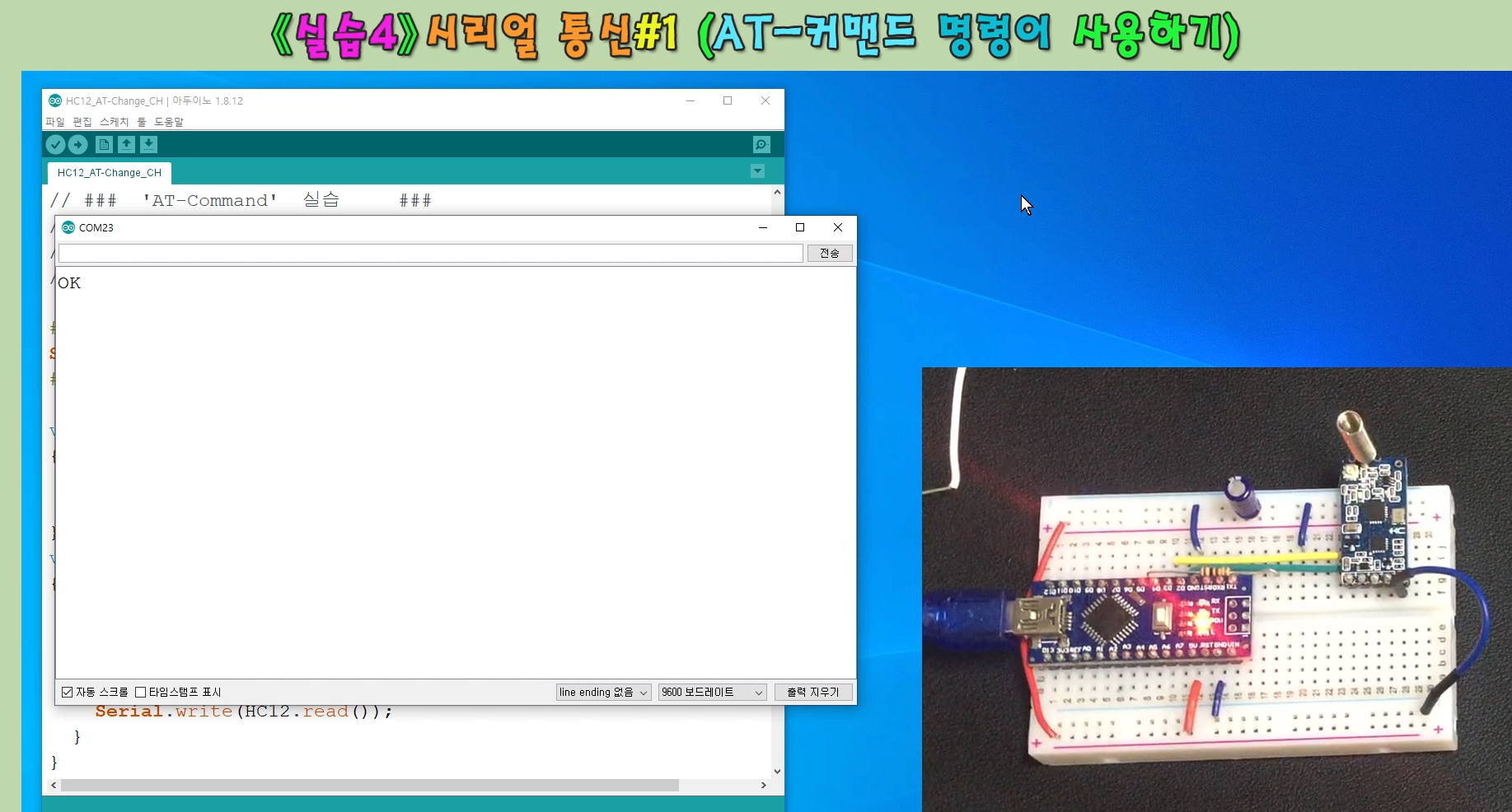 실습 #3은 AT-Command 통신 기능을 사용해보는 실습입니다. AT-명령어를 시리얼 모니터 창으로 입력하여 HC-12 모듈의 채널(주파수) 변경/전송 모드 변경/통신속도/통신 강도 변경 등을 실습합니다.