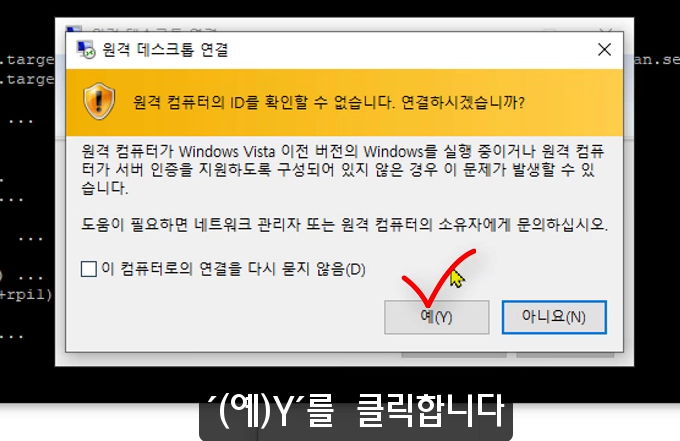 위 이미지처럼, 컴퓨터 항목에, 라즈베리 pi 이름을 입력하고, 연결을 클릭하세요.