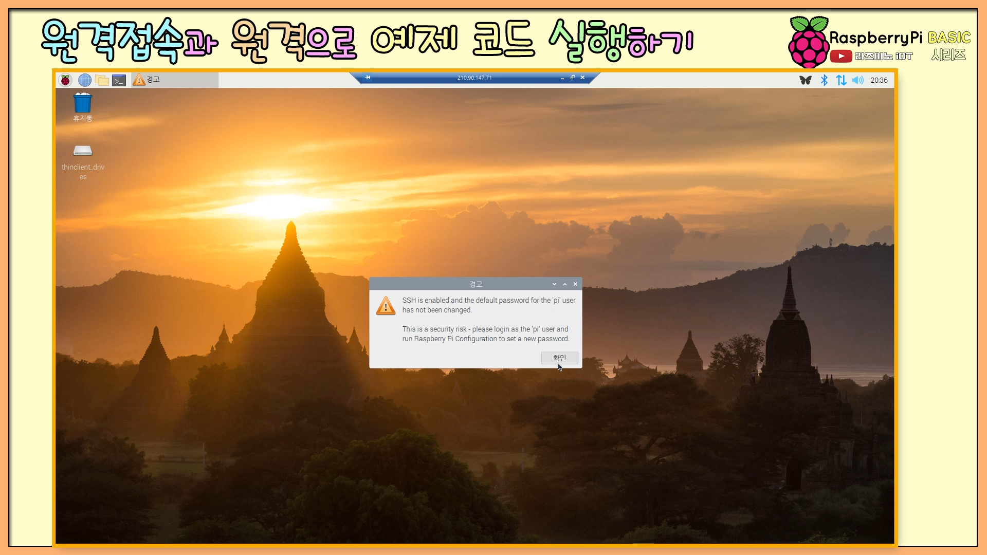 SSH 관련 경고창은 닫아 주면 됩니다. 추후에 필요한 경우, Raspberri pi의 관리자 비번을 변경하면 경고창은 없어집니다. 다만, 변경 후 비번을 잘 기억해 두지 않으면, 시스템 접속이 불가할 수 있으니, 중요한 파일을 다루거나 하지 않거나, 학습용으로 사용한다면, 변경 없이 사용해도 될 것 같습니다.