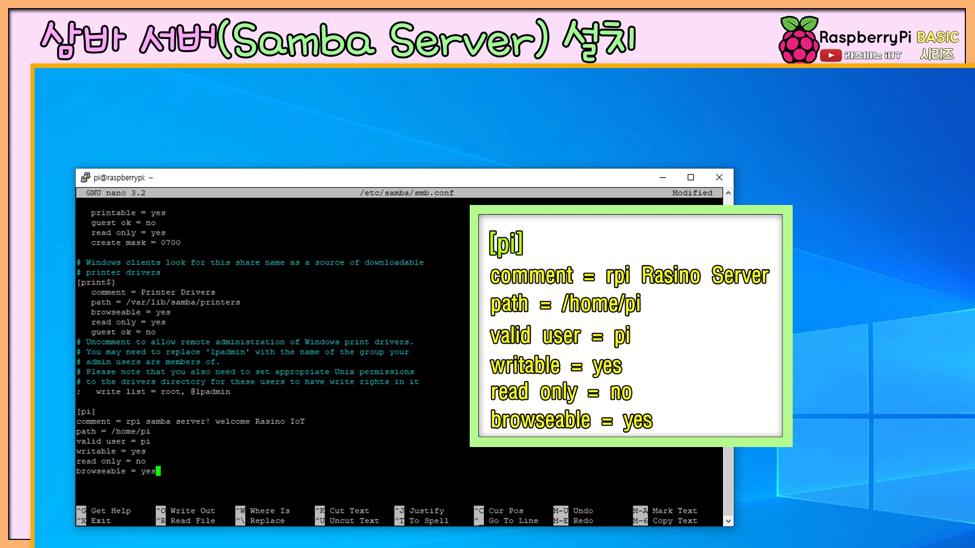 간단한 리눅스용 에디터인 'nano'를 가지고, 삼바 설정 파일에 pi 사용자를 추가해 주는 과정입니다.