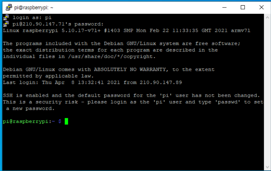 여기서 중요한 것은 라즈베리 Pi의 주소가 외부에서 접속이 되는 공인 IP의 경우는 문제없지만, 대부분의 경우 라우터에서 할당받은 사설 IP인 경우이므로, 원격 접속하려는 PC는 라즈베리 Pi와 동일한 내부망으로 접속해야 합니다.