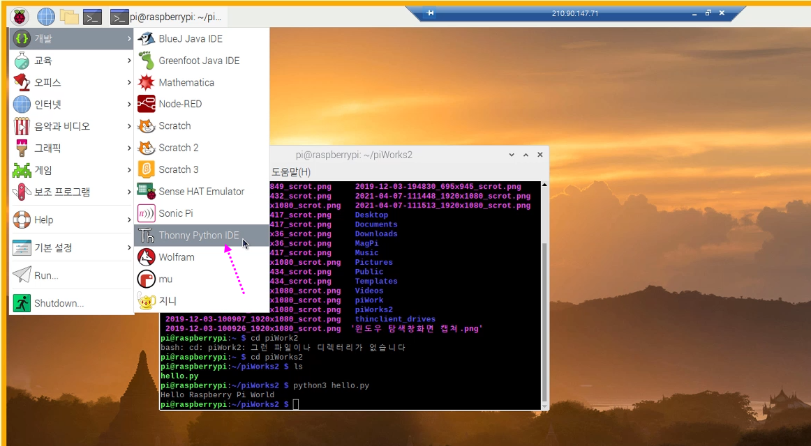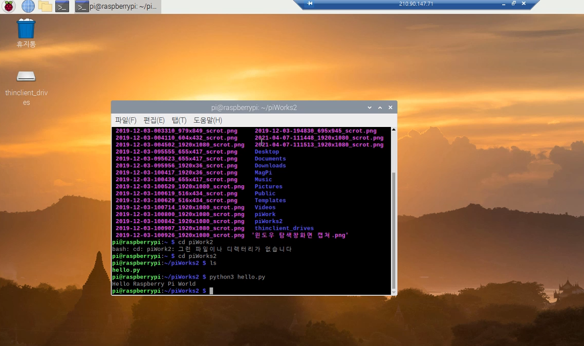 그럼, 다시, 라즈베리 pi 접속창으로 가서, 방금 작성한 파일을 실행시켜 볼게요.