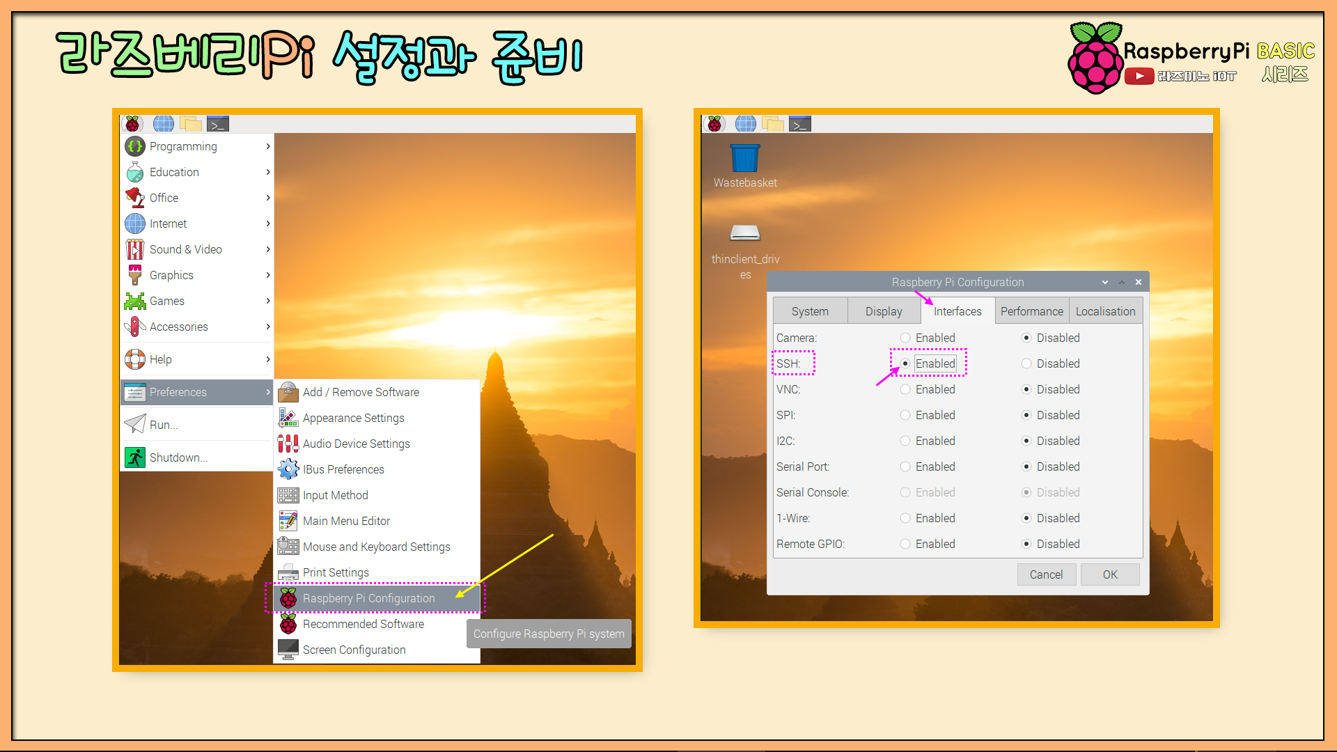 외부에서 라즈베리 Pi로 접속할 수 있도록, 'SSH' 통신 채널을 오픈해 주어야 합니다.
