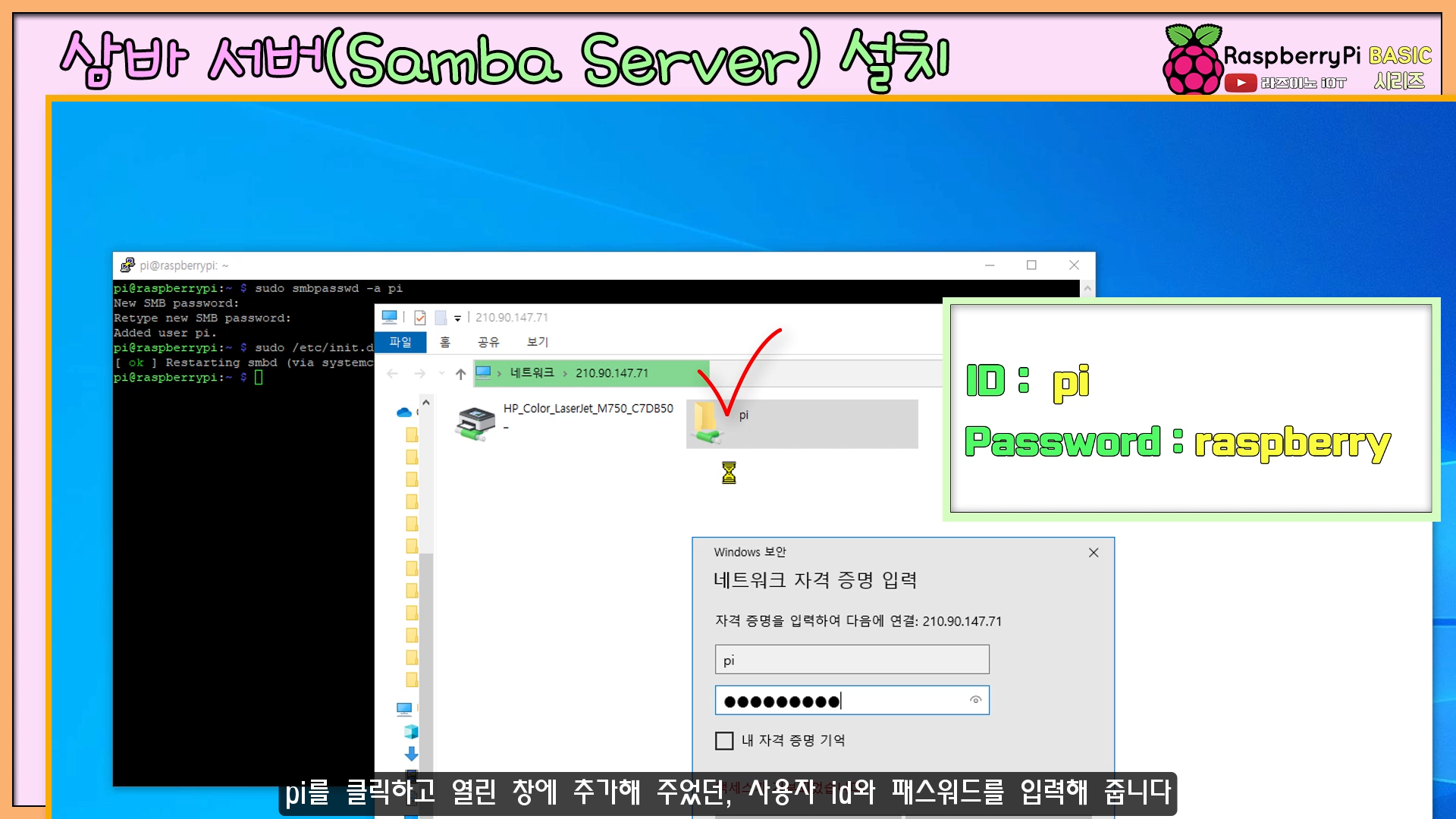 아래처럼, 윈도 탐색 창이 열리면, pi 드라이브를 클릭하고 열린 창에 추가해 주었던, 사용자 id와 패스워드를 입력해 줍니다.