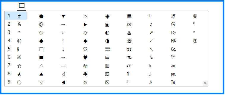 ㆍ ⦁ ∎ ◦ ∘ ∙ ⋅ ▪ ▫ ■ ○ ▲ △ ▴ ▵ ▶ ▷ ▸ ▹ ► ▻ ▼ ▽ ▾ ▿ ◀ ◁ ◂ ◃ ◄ ◅ ◆ ◇ ◈ ◉