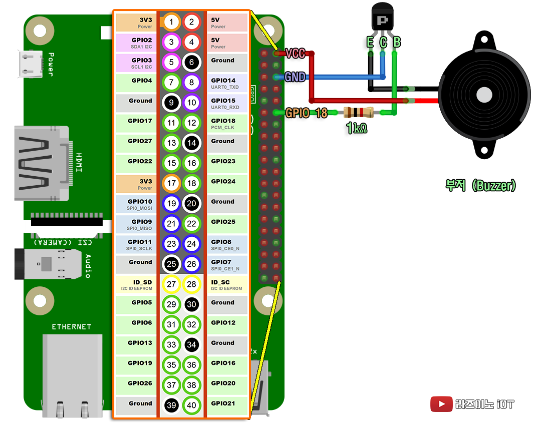 기본적으로 아래처럼 라즈베리 Pi 포트 출력으로 직접 부저를 작동시키는 연결을 하면 됩니다.