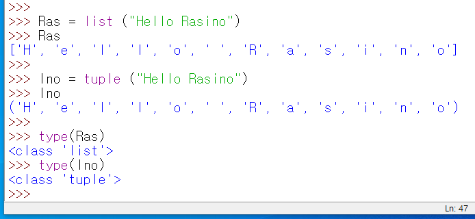 아래처럼 list( ) 함수와, tuple( ) 함수를 이용하면, 리스트 데이터를 튜플데이터로, 튜플데이터를 리스트 데이터로 상호 변환이 가능합니다.