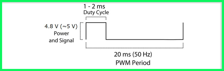 서보모터는 20ms 주기의 펄스파에서 High 신호 파형을 1ms~2ms 범위를 가지고, 회전 각도가 정해지며, 180˚ 서보의 경우, 1ms 신호일 때, 0˚의 위치로 이동하며, 1.5ms 이면 90˚ , 2ms 일 때 180˚의 위치로 이동하게 됩니다.