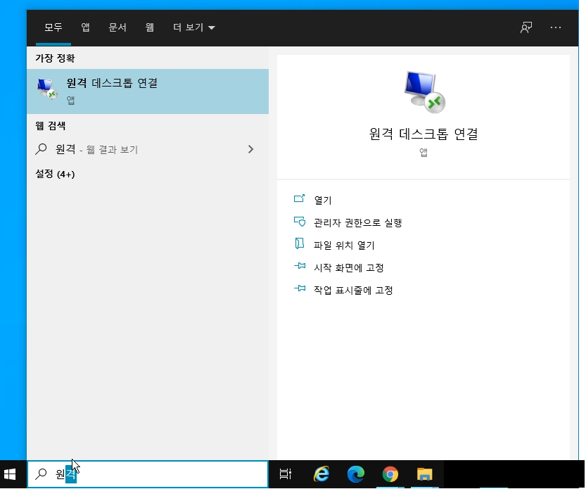 먼저, 윈도 시작 메뉴 검색에서 ‘원격 데스크톱 연결’을 검색해서 실행합니다.