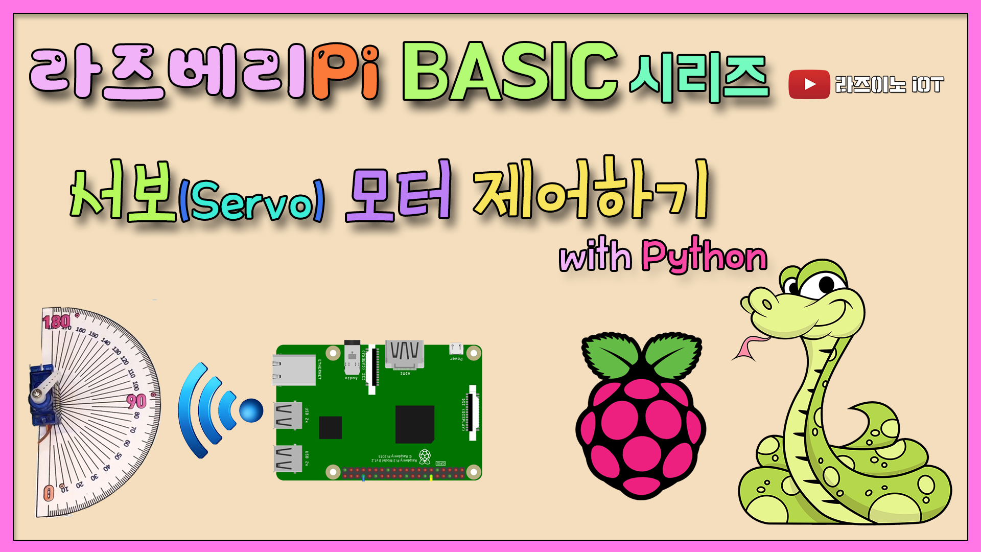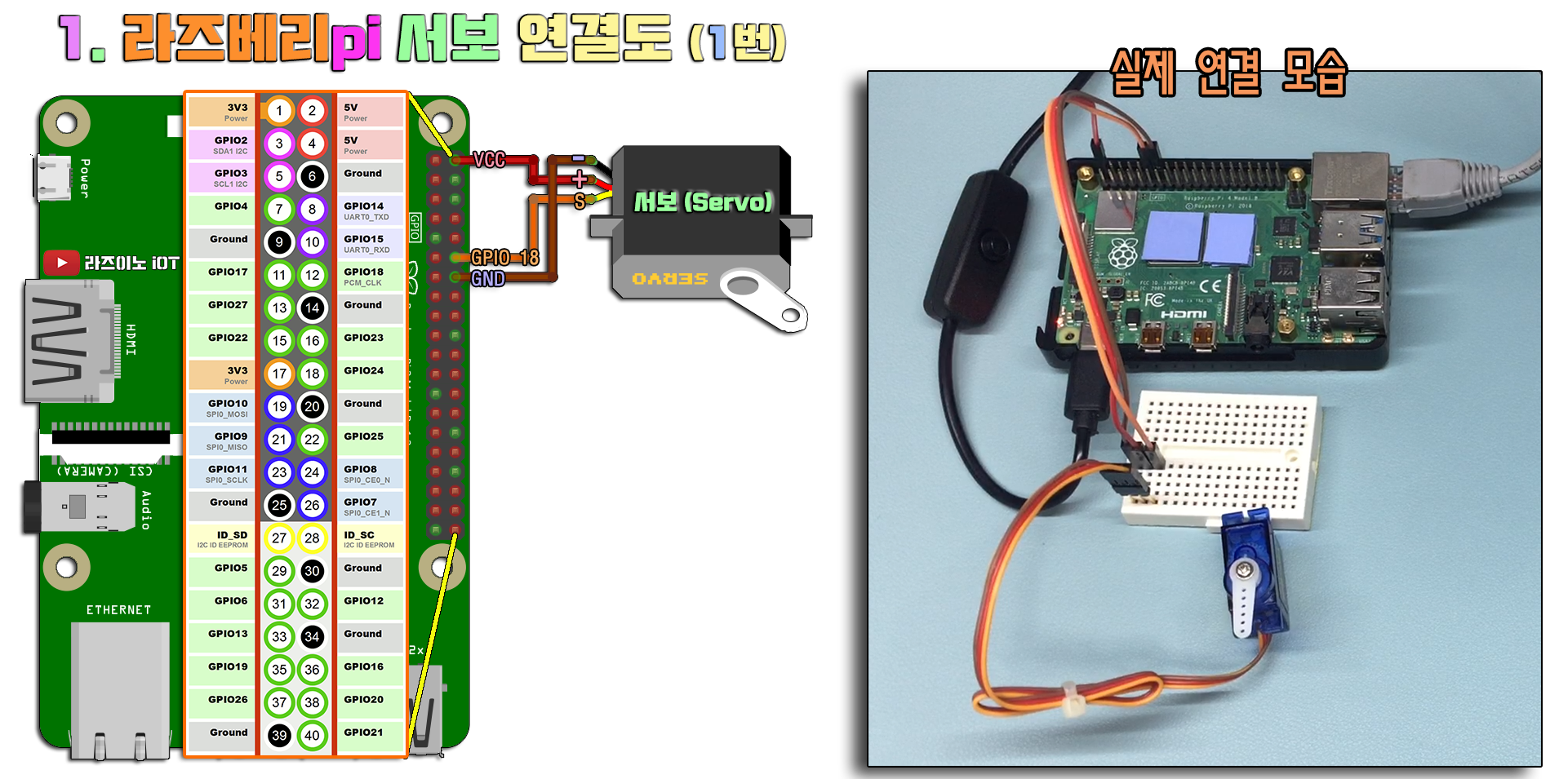 이번 시간에는 라즈베리 Pi에서 각도단위로 매우 정확하게 움직이는 서보모터를 파이썬 코드로 제어해보는 실습입니다.