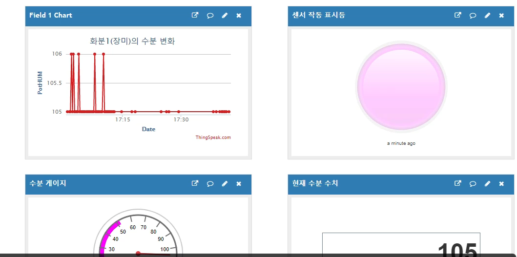 만약, 자신이 부여받은 API키나 서버 관련 정보가 정확하지 않다면, 아두이노 자동물공급 기능은 실행 되는데 문제 없지만 서버로 데이터가 전달되지 않아 웹이나 앱에서 값이 제대로 표시되지 않을 수 있습니다.